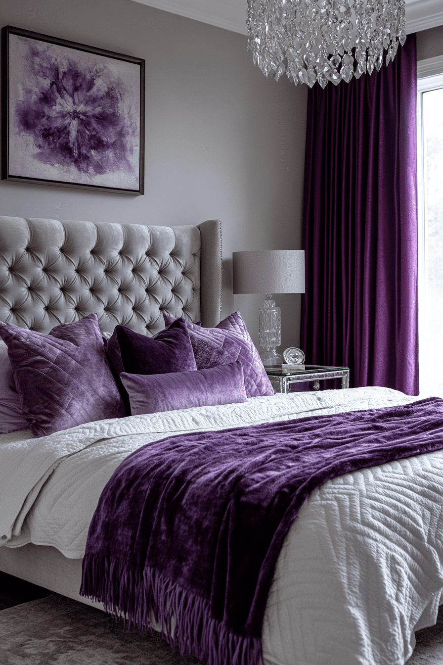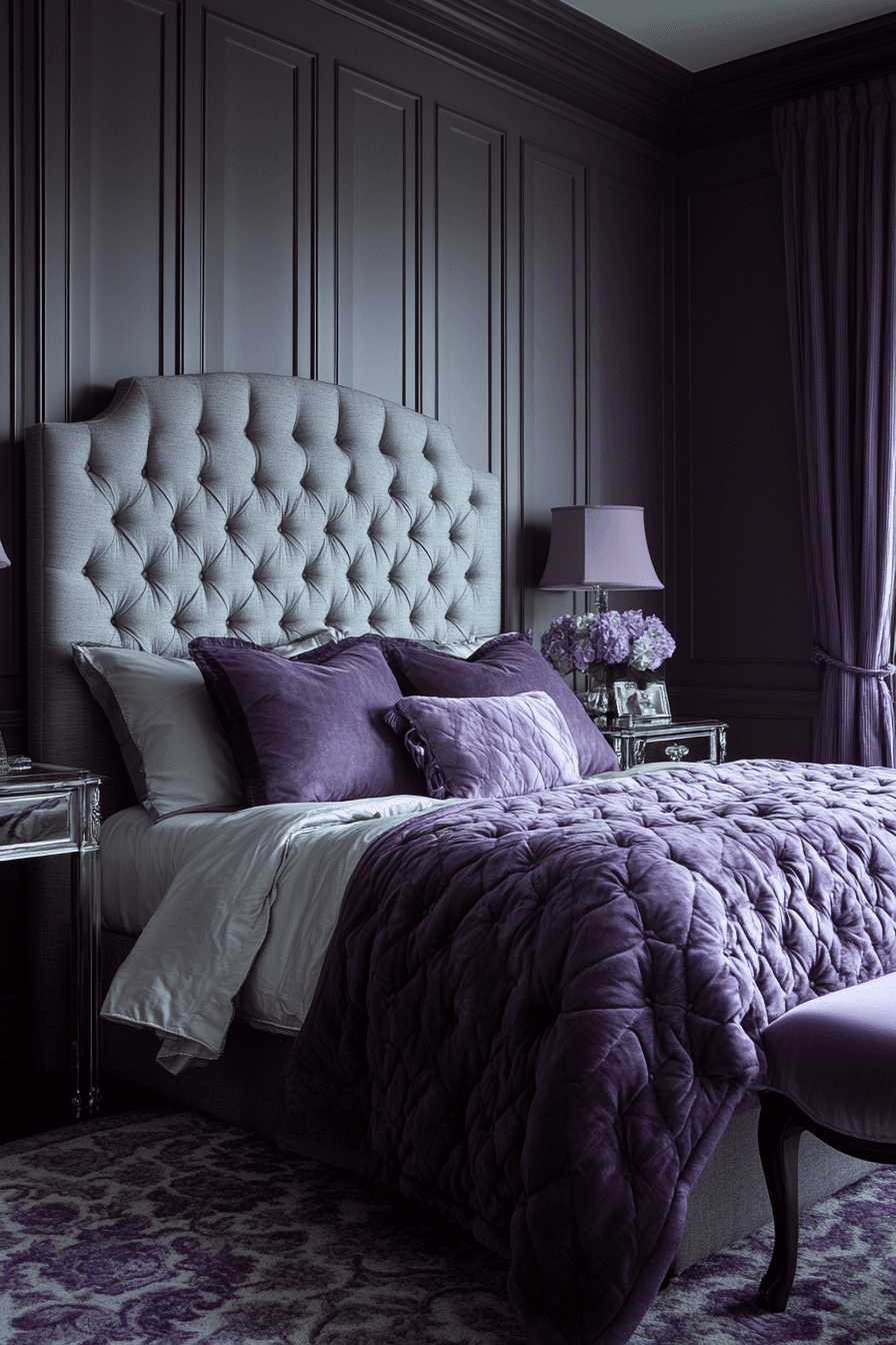 Elegant grey and amethyst blends add refinement to purple and grey bedroom ideas. Amethyst tones elevate the space with jewel-like richness. Grey balances the sparkle with cool sophistication. Together, they create a luxurious yet approachable design. This works because it feels timeless and bold. Click now to see more elegant amethyst and grey blends.