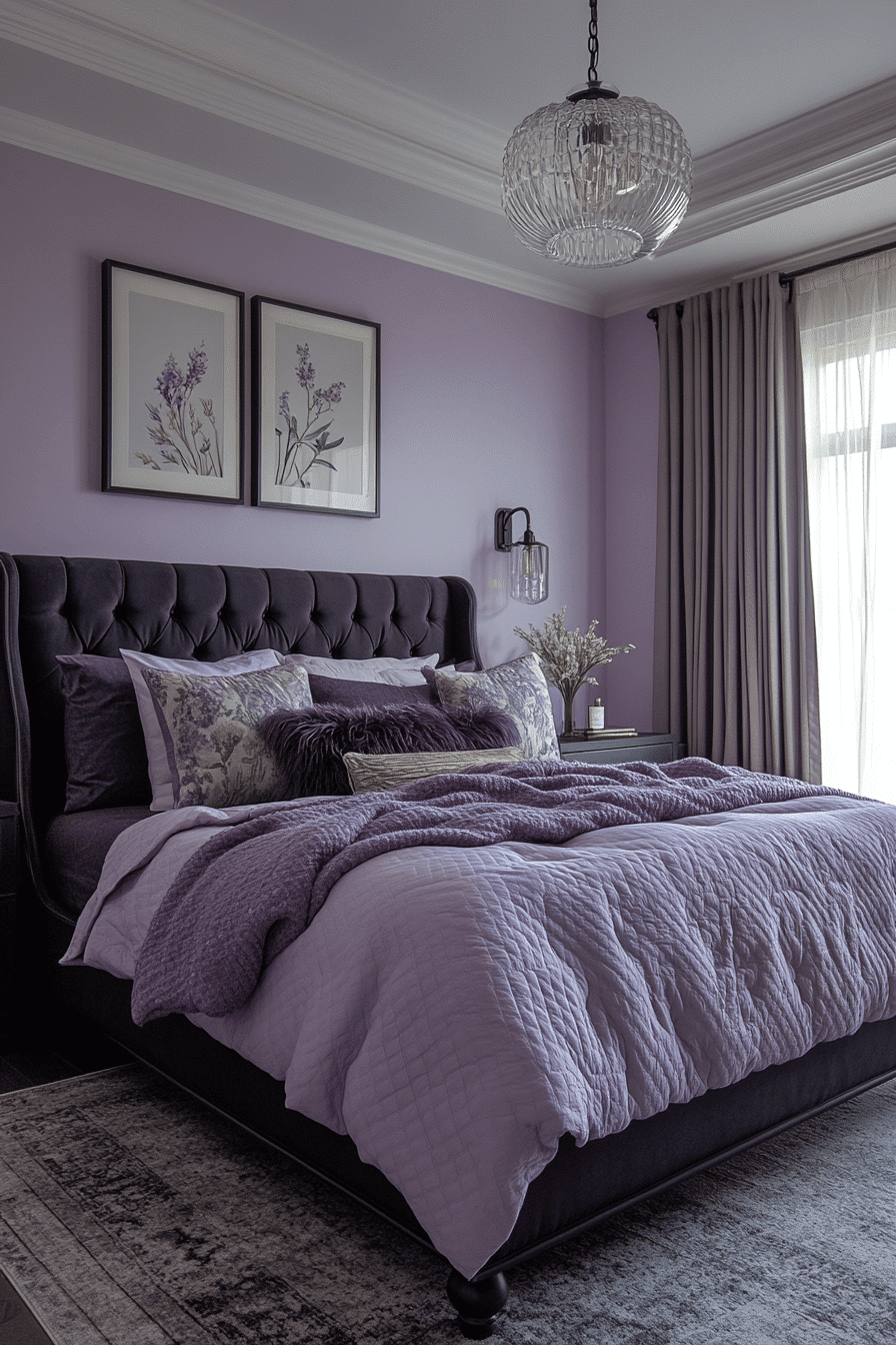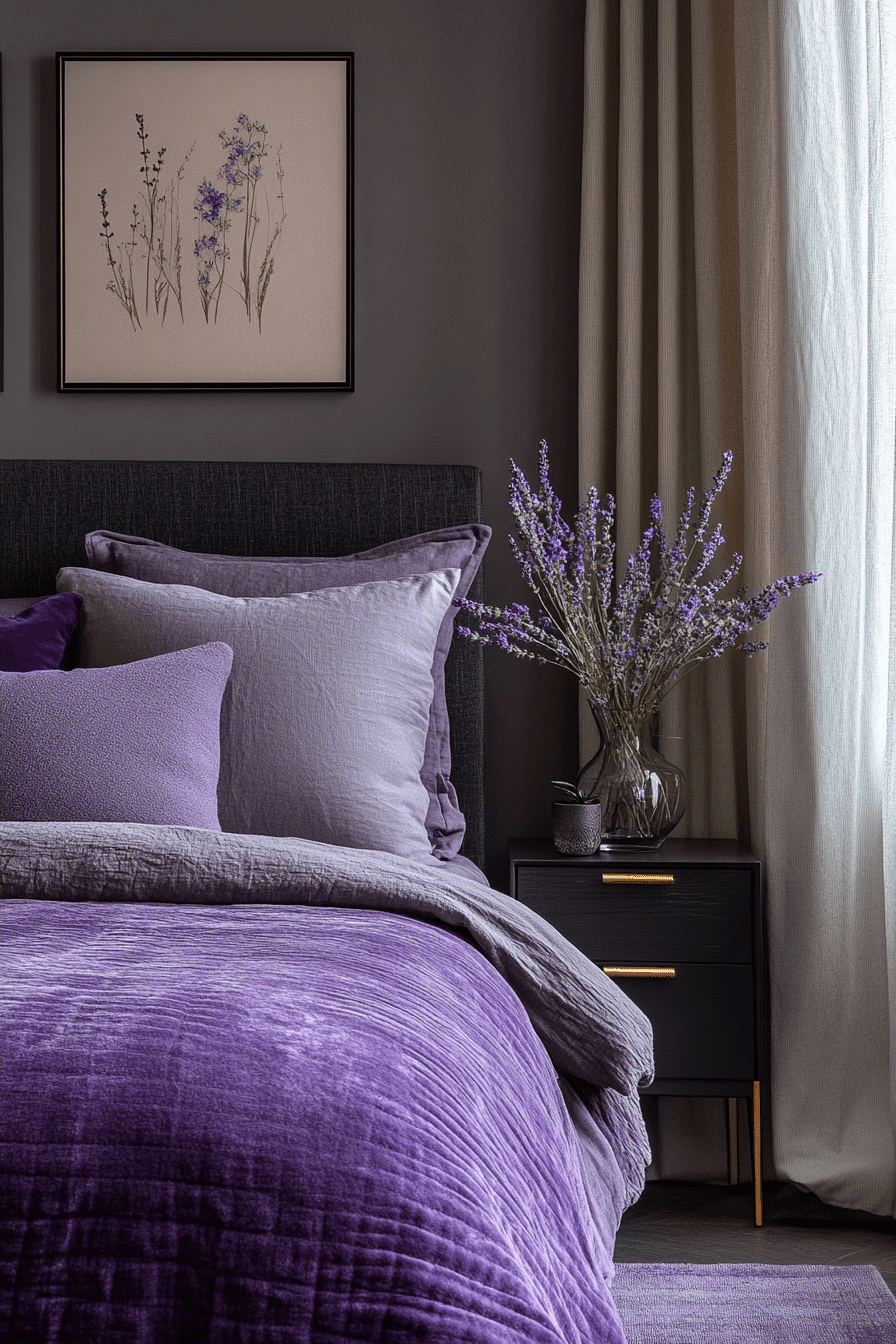 Lavender and charcoal purple and grey bedroom ideas create a dreamy mix of softness and depth. Light lavender walls paired with dark charcoal furniture strike a perfect contrast. Plush textiles in both shades tie the look together seamlessly. Subtle lighting brings out the richness of the darker tones while keeping the lavender airy. This works because it layers depth and coziness in one beautiful design. Tap now to discover how lavender and charcoal can transform your bedroom.