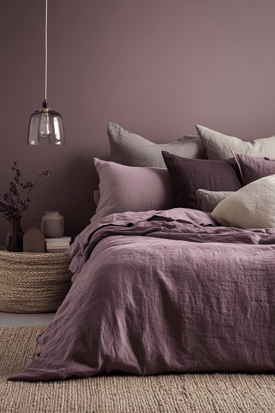 Modern mauve and grey layered purple and grey bedroom ideas feel sophisticated. Mauve brings depth, while grey balances with cool neutrality. Layered textiles and décor enhance the dimensional palette. Sleek furniture ties everything together. This works because it builds interest without clutter. Tap here to explore mauve and grey layered bedrooms.