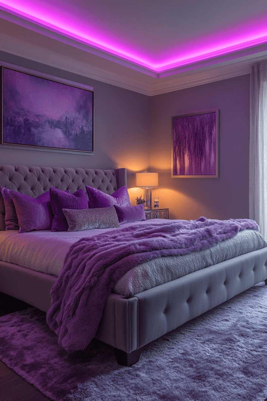 Purple glow purple and grey bedroom ideas showcase how lighting can redefine a space. Soft purple LED strips or lamps add mood and warmth against a grey backdrop. Textured fabrics reflect the glow, creating a cozy, modern feel. The design is versatile, perfect for both relaxing evenings and energetic mornings. This combination works because it merges technology with style in a playful way. Tap here to find more glowing purple and grey bedroom inspiration.