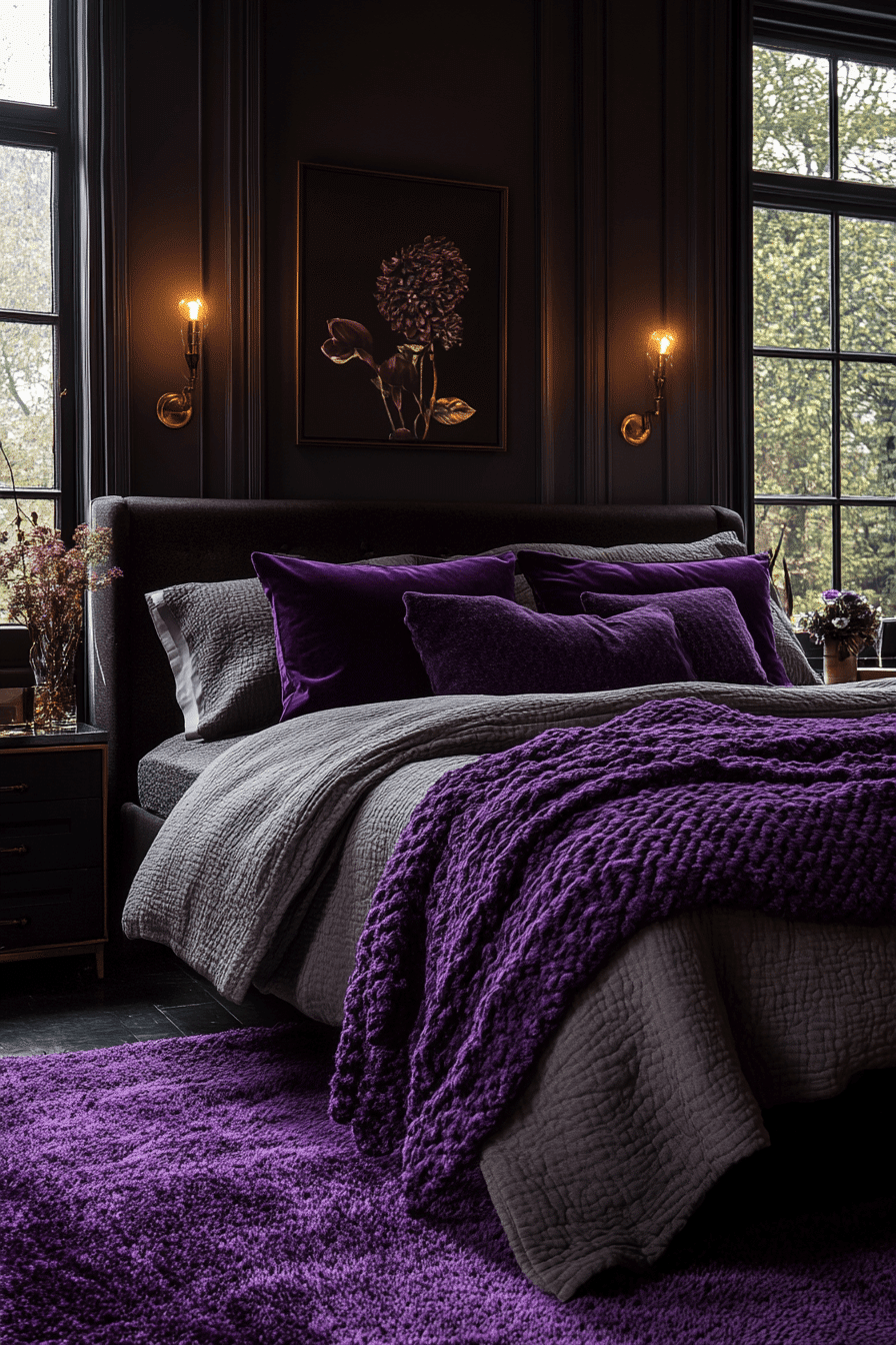Deep plum paired with slate grey creates rich and cozy purple and grey bedroom ideas. Plum adds bold personality, while slate keeps the look grounded. Plush bedding and thick rugs bring warmth into the space. Accent lighting enhances the richness of both colors. This works beautifully because it feels both luxurious and inviting. Discover how plum and slate bring comfort by clicking here.