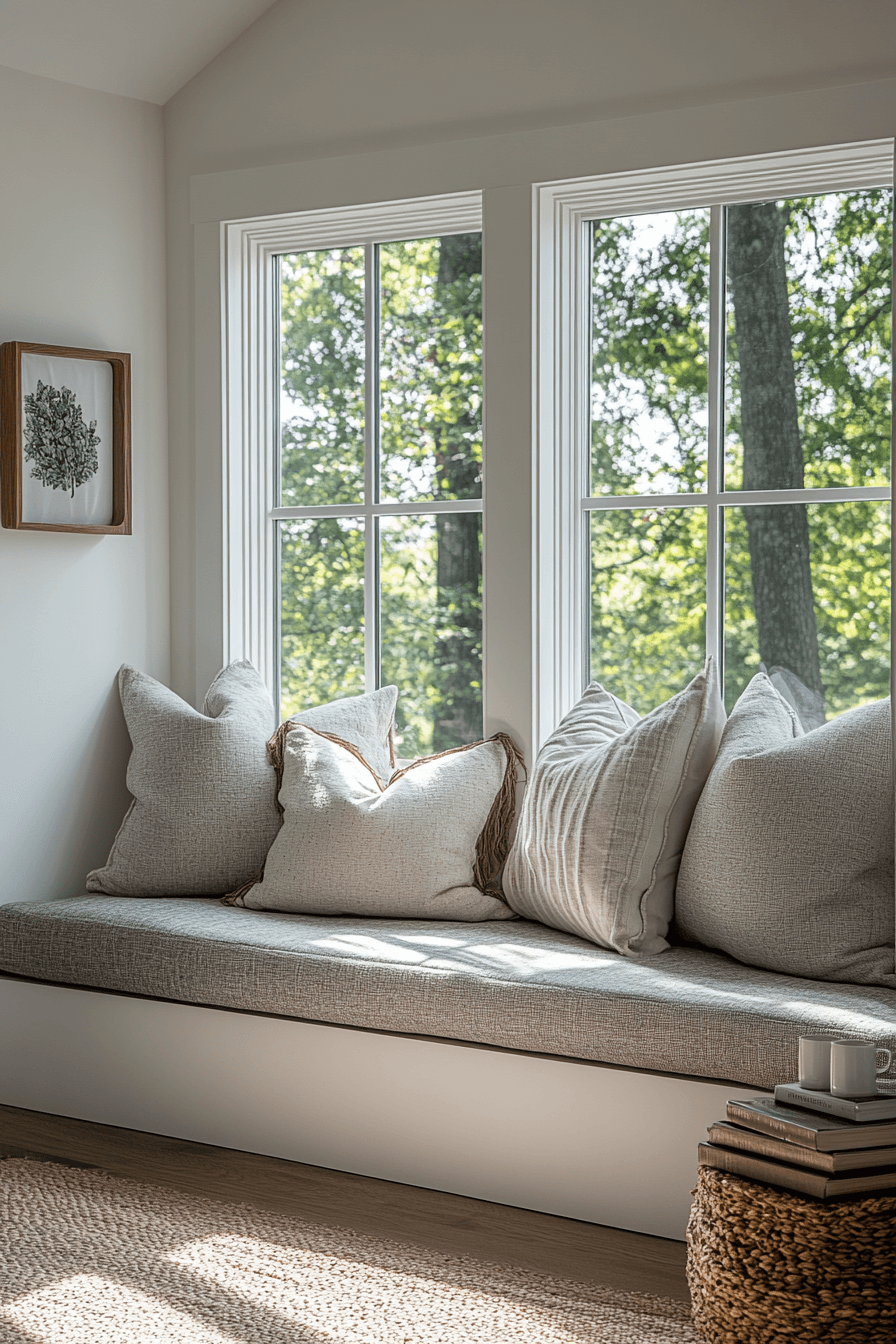 Modern window reading nook creates the perfect balance of simplicity and comfort by letting in generous streams of natural light. The sleek lines, paired with minimalist seating, ensure the area feels uncluttered yet stylish, while soft throws and plush cushions make it irresistibly cozy. Large panes of glass frame the outdoors beautifully, turning the view into living art that enhances focus and relaxation. This style is popular for blending contemporary function with tranquil vibes, making it ideal for both morning coffee reads and late-night novels. Add personal accents like a side table or statement lamp to make the nook uniquely yours. Discover more inspiring modern window reading nook ideas and elevate your space with ease!