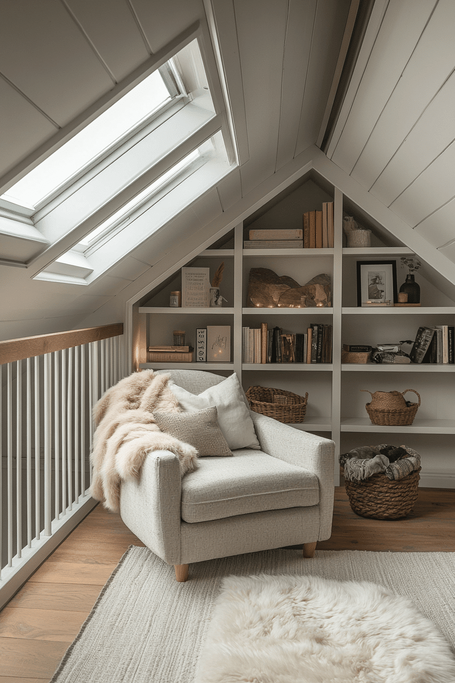 An elevated loft reading nook takes advantage of upper-level spaces, transforming them into creative and inspiring escapes. The lofty height adds an airy, open feel, while soft seating and sleek shelving create a polished yet cozy atmosphere. Natural light from skylights or tall windows enhances the sense of spaciousness, making it ideal for daytime reading. This style is loved because it turns unused lofts into personal retreats that feel both private and uplifting. Add a small desk, ladder, or accent lighting to make it versatile for more than just reading. Tap to explore elevated loft reading nook transformations that maximize hidden potential!