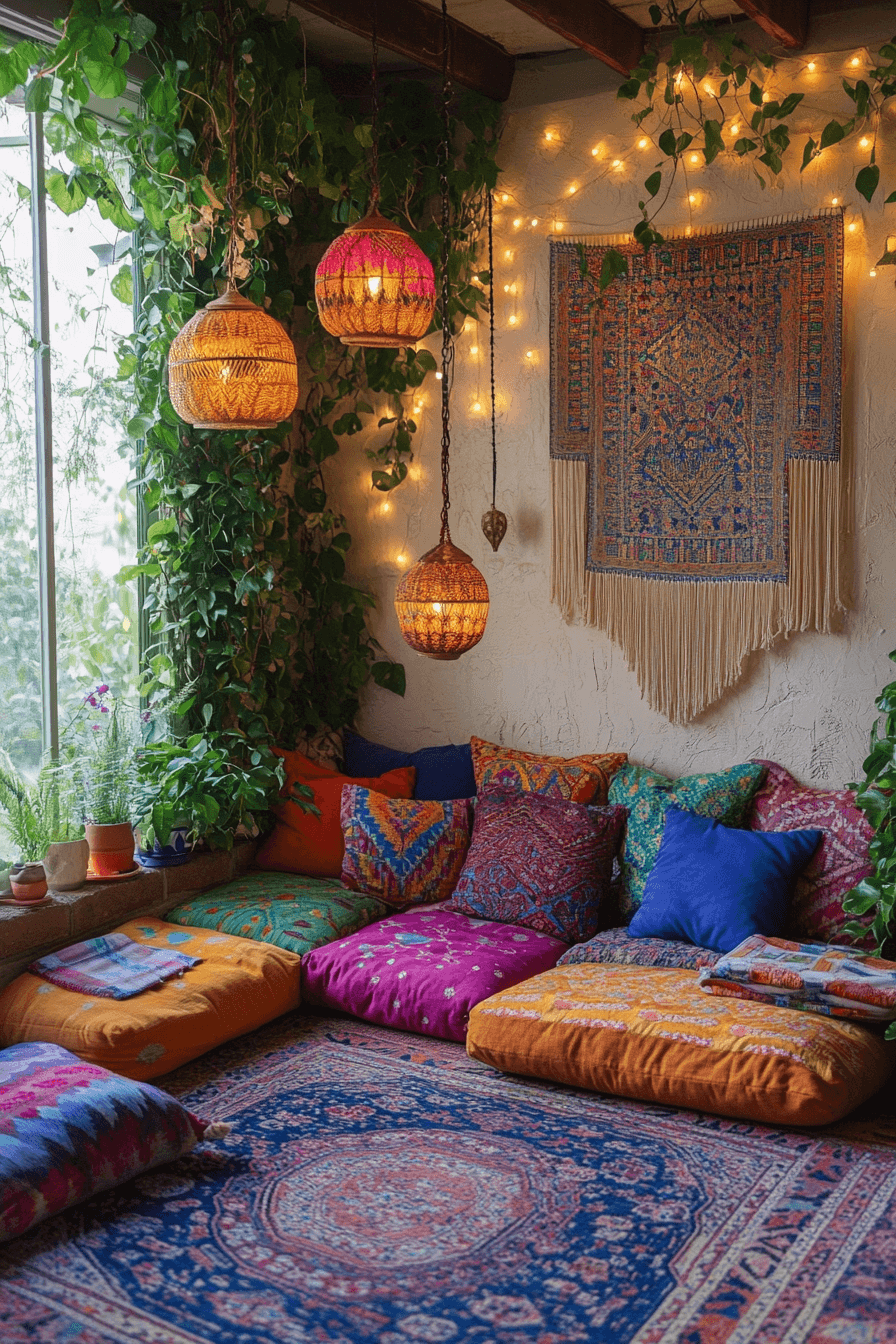 A boho floor cushion reading nook radiates carefree comfort and creativity. Piled rugs, layered pillows, and mismatched patterns create an inviting and playful space. The floor-level seating makes it approachable and casual, while plants and lanterns add natural warmth and ambiance. This design works beautifully for anyone who enjoys relaxed, free-spirited style in their home. Its eclectic mix of textures and colors ensures no two spaces ever look alike. Explore boho floor cushion reading nook ideas that bring charm and individuality into your space today!