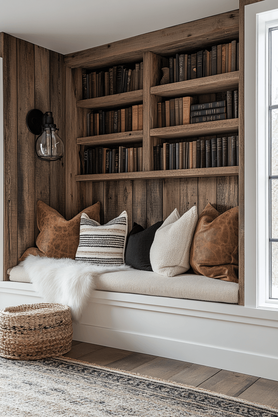 Modern rustic reading nook beautifully combines sleek design with natural textures. Reclaimed wood and industrial accents add character, while clean lines keep the look fresh and modern. Plush textiles like faux fur or chunky knits soften the space, making it warm and inviting. This design appeals because it balances rugged charm with contemporary polish. Whether placed in a cabin or a city loft, it delivers timeless coziness. Explore modern rustic reading nook inspirations that blend the best of old and new!