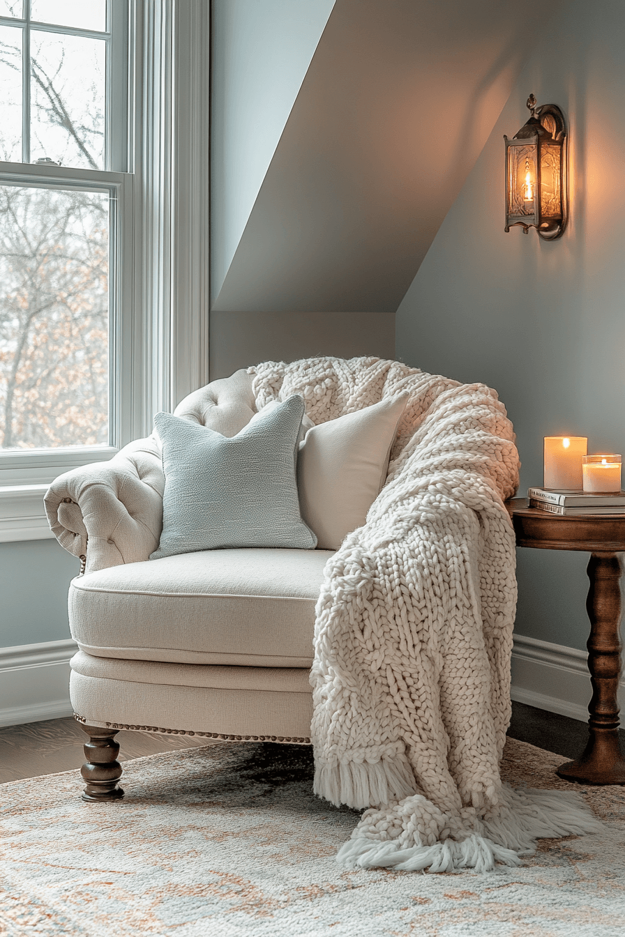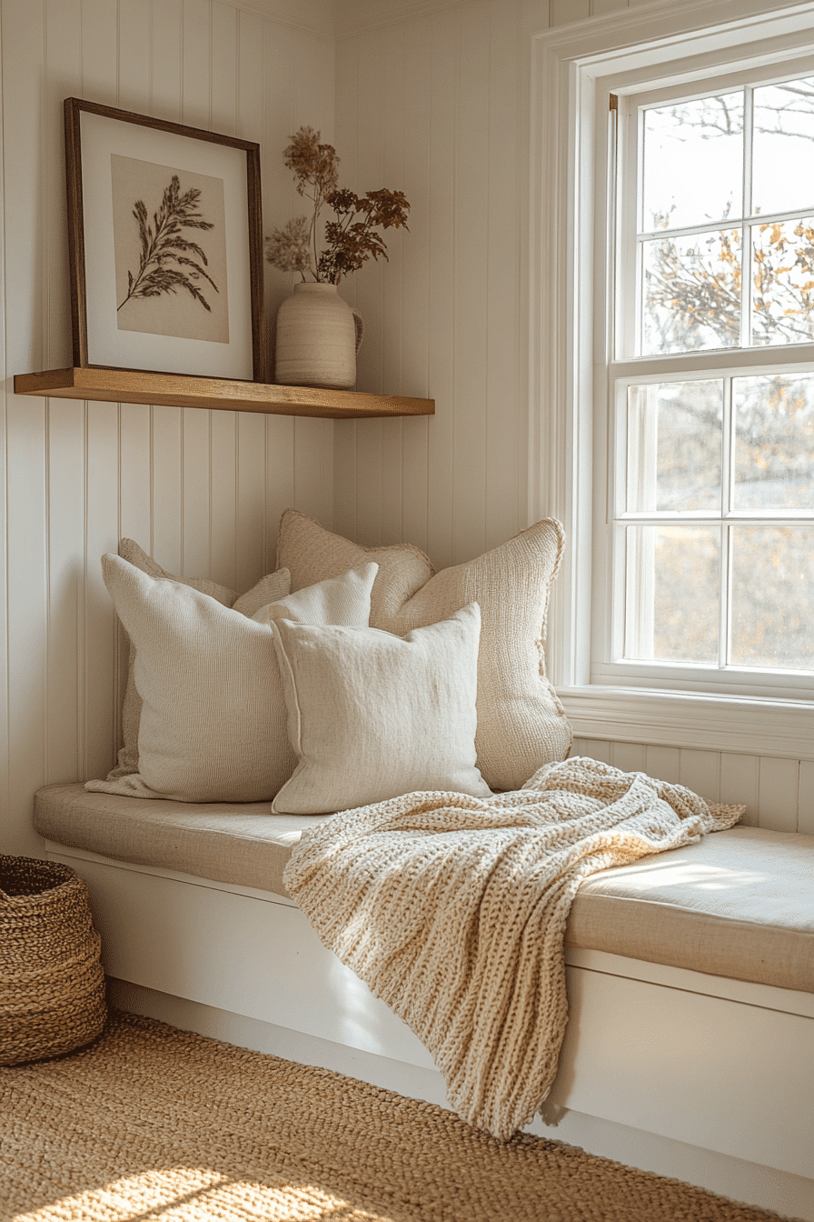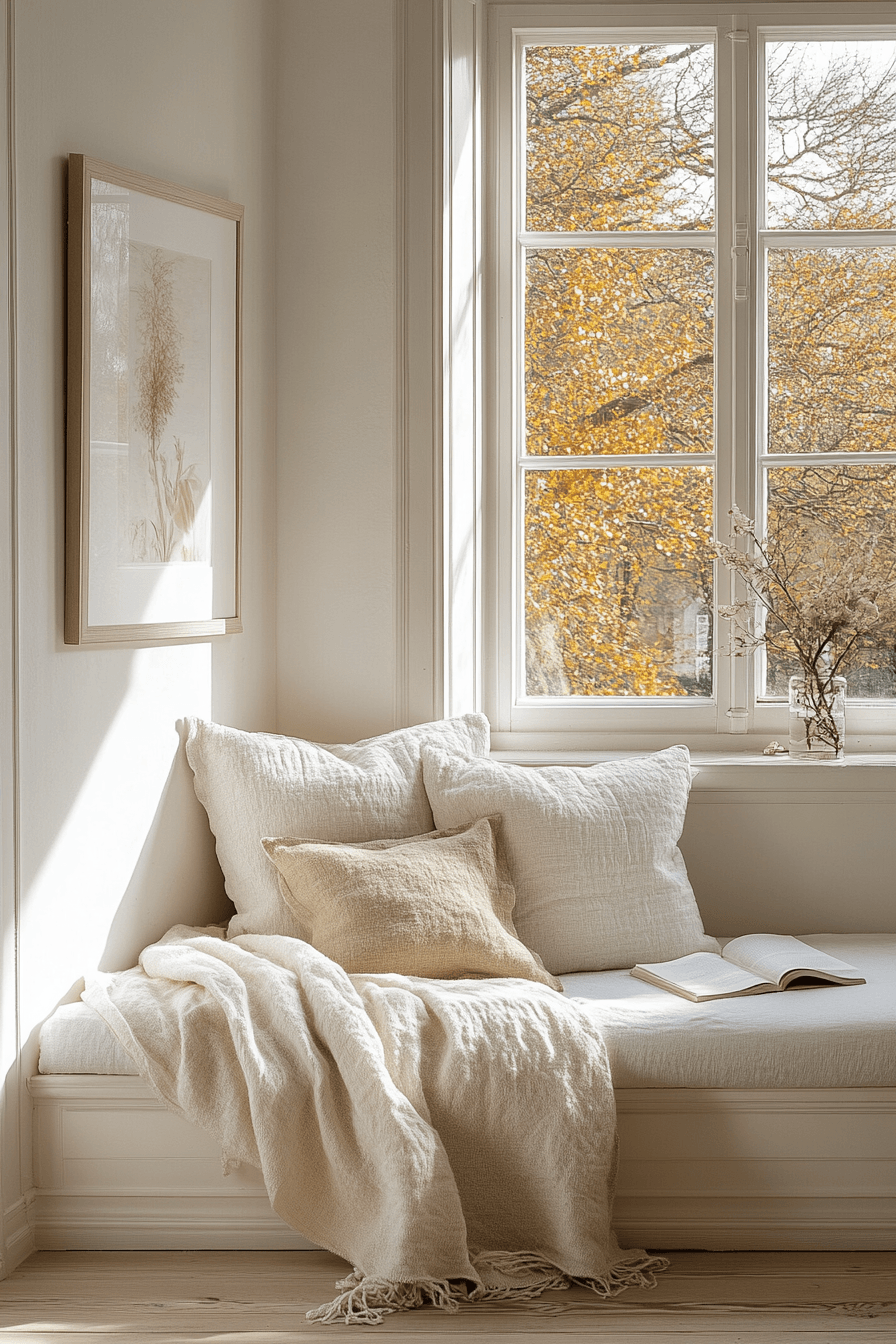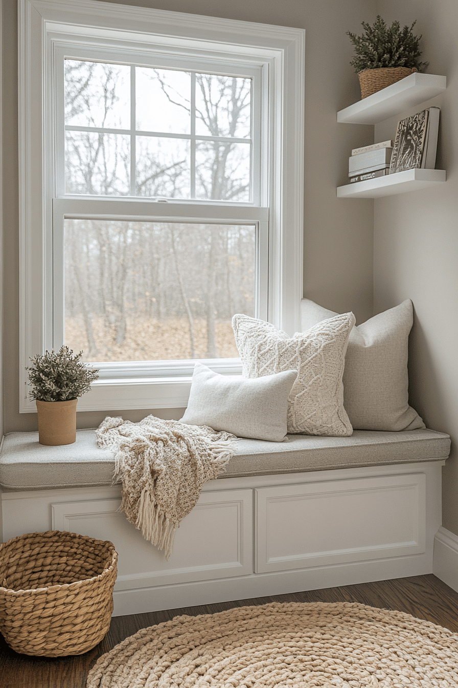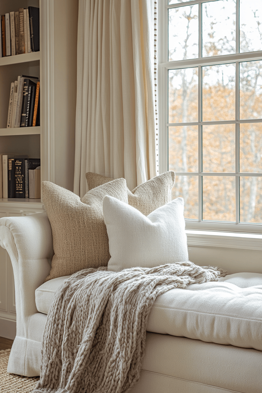 Neutral cozy reading nook offers timeless comfort through its soft, calming palette of beige, ivory, and gray. Plush pillows, knit blankets, and layered rugs make the nook irresistibly snug, while simple furniture keeps it versatile. Its understated beauty ensures it fits seamlessly into any décor style, from farmhouse to modern. The focus on comfort makes it an easy favorite for anyone seeking a peaceful retreat. Its simplicity also makes it easy to refresh with seasonal accents. Tap here to see neutral cozy reading nook ideas that bring effortless charm and relaxation!