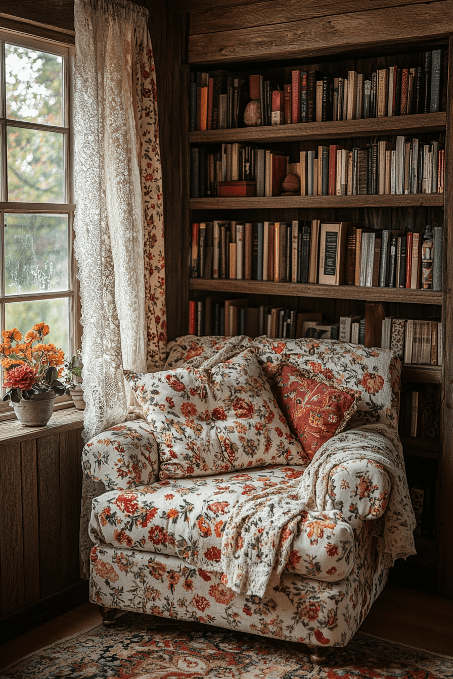 Cottagecore reading nook feels like stepping into the pages of a storybook. Floral prints, vintage-inspired fabrics, and rustic wood details create a whimsical, romantic vibe. Soft lighting from candles or fairy lights enhances the cozy atmosphere, while layered blankets and lace accents add charm. This nook is beloved because it celebrates comfort, nostalgia, and the beauty of simplicity. Perfect for curling up with a classic novel, it invites slow, meaningful moments. Explore cottagecore reading nook ideas that turn your home into a cozy retreat full of magic!