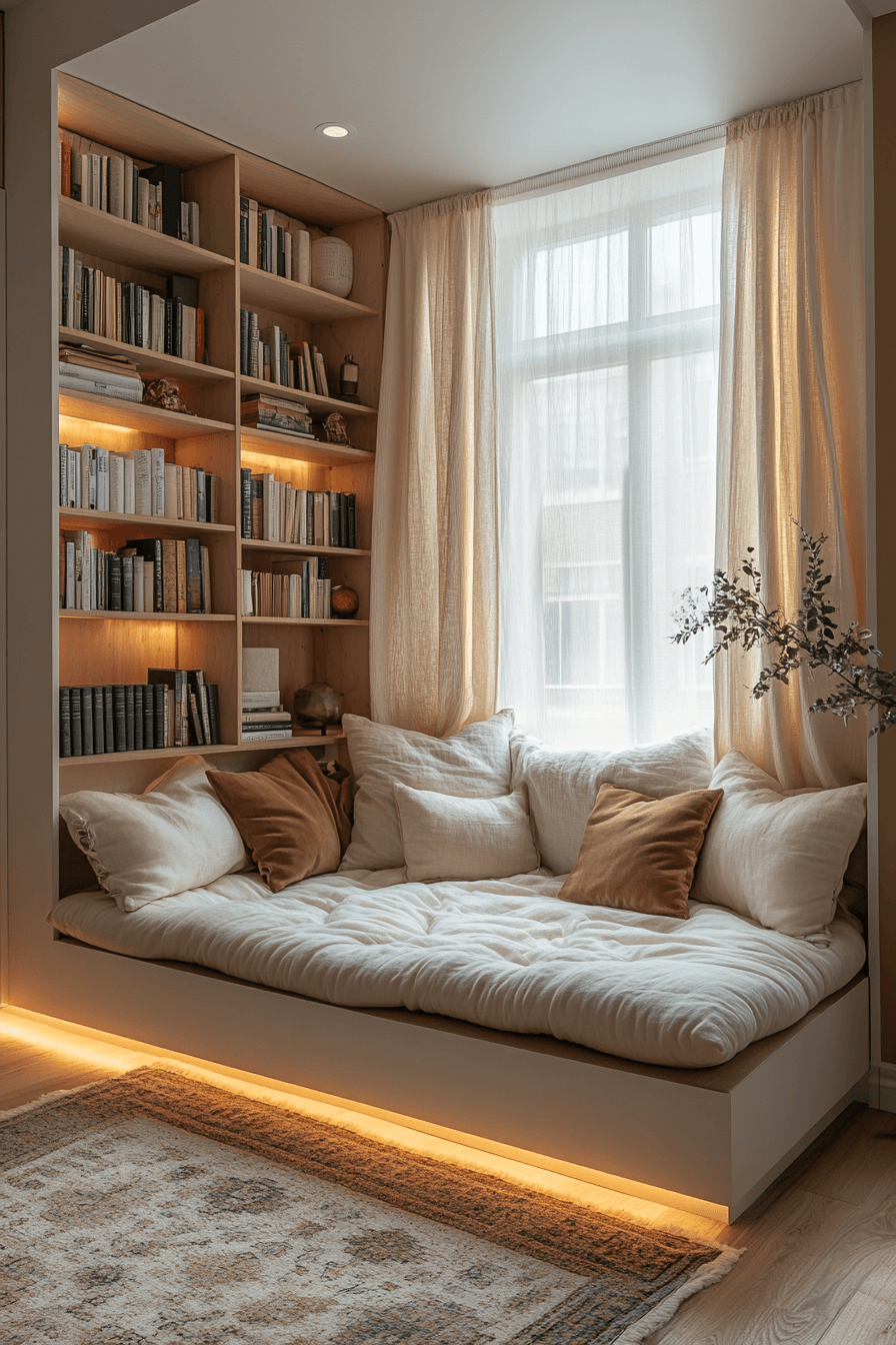 A studio apartment reading nook blends practicality with coziness in compact living. Clever dividers, shelving, or curtains can define the nook while doubling as storage. Multi-purpose furniture like convertible benches ensures the space stays functional without clutter. Neutral colors and layered textures keep it cozy without overwhelming the small area. This design proves you can carve out a personal retreat even in the busiest city studios. Click here to uncover studio apartment reading nook inspirations that bring calm to compact living!