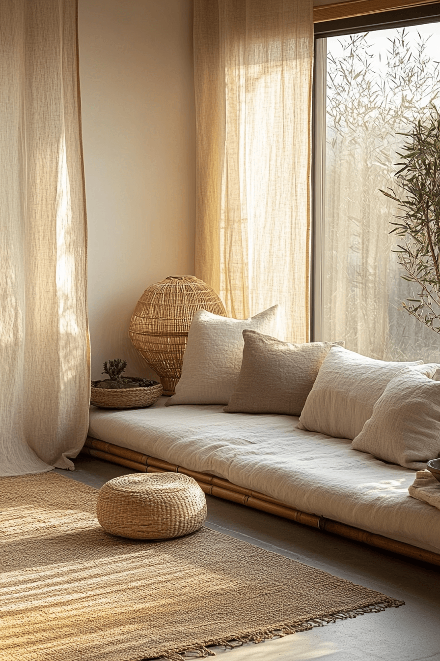 Wabi-sabi reading nook embraces imperfections and natural beauty, creating a retreat that feels grounded and authentic. Rough-hewn wood, handmade pottery, and muted earthy tones give the nook character and warmth. Simple seating, such as a linen cushion or wooden bench, enhances the intentional minimalism. The design resonates because it finds elegance in imperfection, inviting readers to slow down and savor the moment. It’s ideal for those who value mindfulness and authenticity in their living spaces. Explore wabi-sabi reading nook ideas that celebrate natural simplicity today!