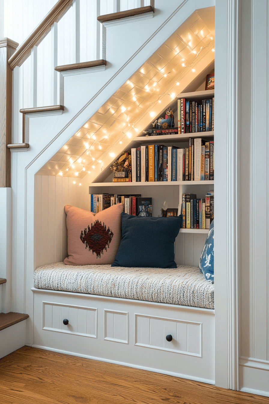 An under-stair reading nook transforms overlooked space into a charming hideout for book lovers. Custom cushions, twinkle lights, and soft throws make it feel magical, while built-in shelving adds smart storage for books or décor. The enclosed structure gives a cocoon-like effect, making it a retreat within your home. Whether styled modern or rustic, this nook instantly adds personality and surprise. It’s especially adored in family homes where both kids and adults can enjoy it. Click here to explore creative under-stair reading nook ideas that maximize charm and function!