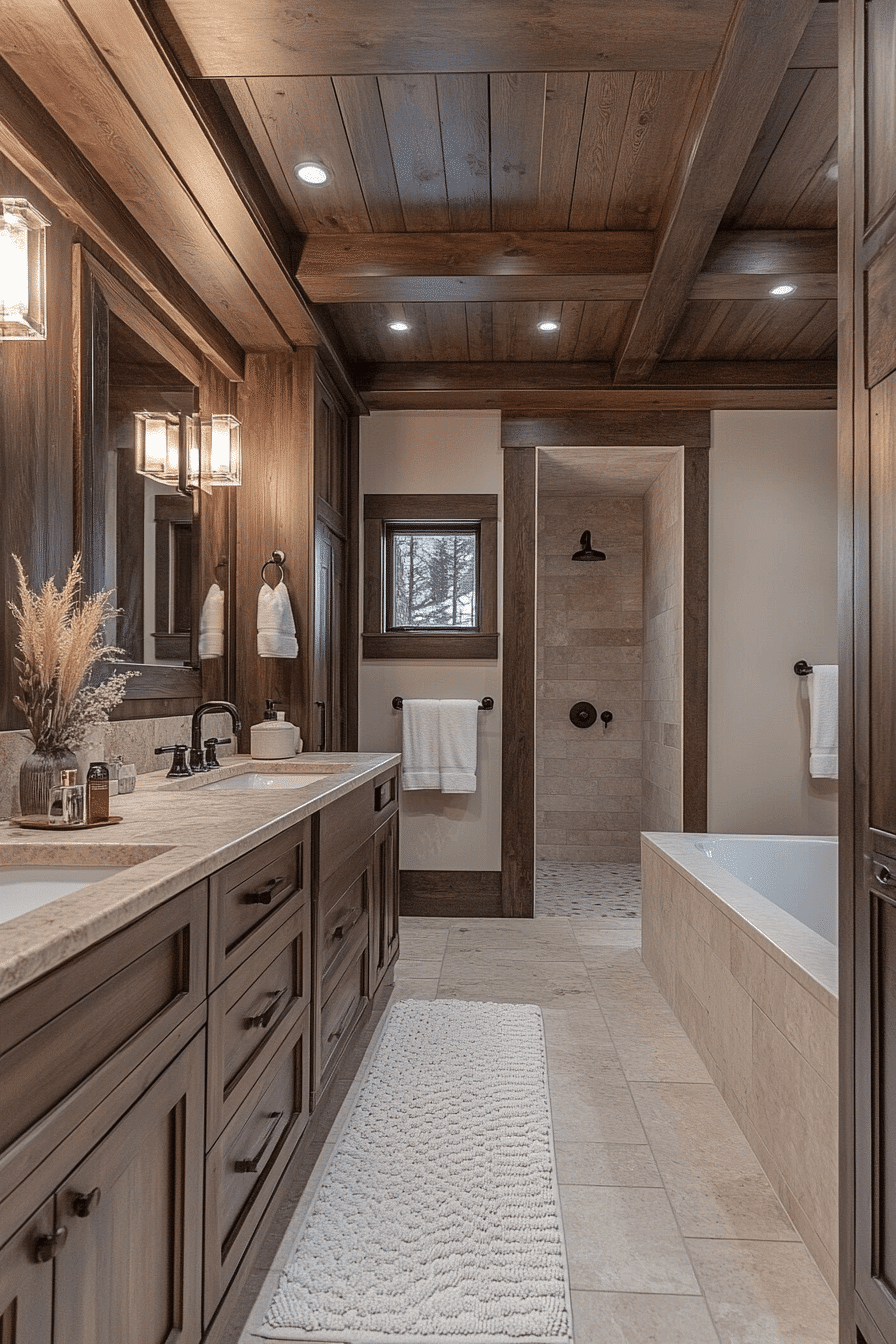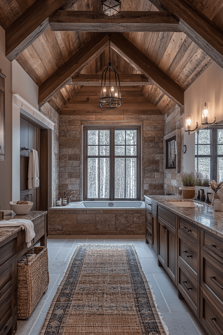 Lofted ceilings add grandeur to rustic bathroom designs by emphasizing height and space. Exposed beams draw the eye upward. Neutral cabinetry and stone finishes ground the room in rustic authenticity. Pendant lights enhance vertical drama while maintaining warmth. The design feels both open and cozy. Tap here to explore rustic bathroom designs with lofted ceilings.