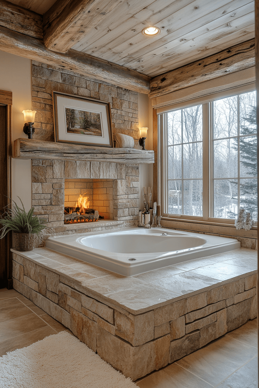 A fireplace inside the bathroom is a luxurious take on rustic bathroom designs. Stone surrounds emphasize warmth and authenticity. The fireplace doubles as a striking focal point. Wooden accents balance the ruggedness of stone. Soft lighting enhances coziness. Click here to see rustic bathroom designs with fireplace features.