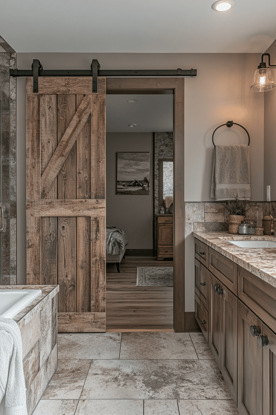 Sliding barn doors add charm and practicality to rustic bathroom designs. Wooden doors create texture and style while saving space. Neutral palettes enhance their impact. Stone counters and cabinetry balance durability with warmth. Lighting highlights the door as a focal point. Tap here to explore rustic bathroom designs with barn door features.