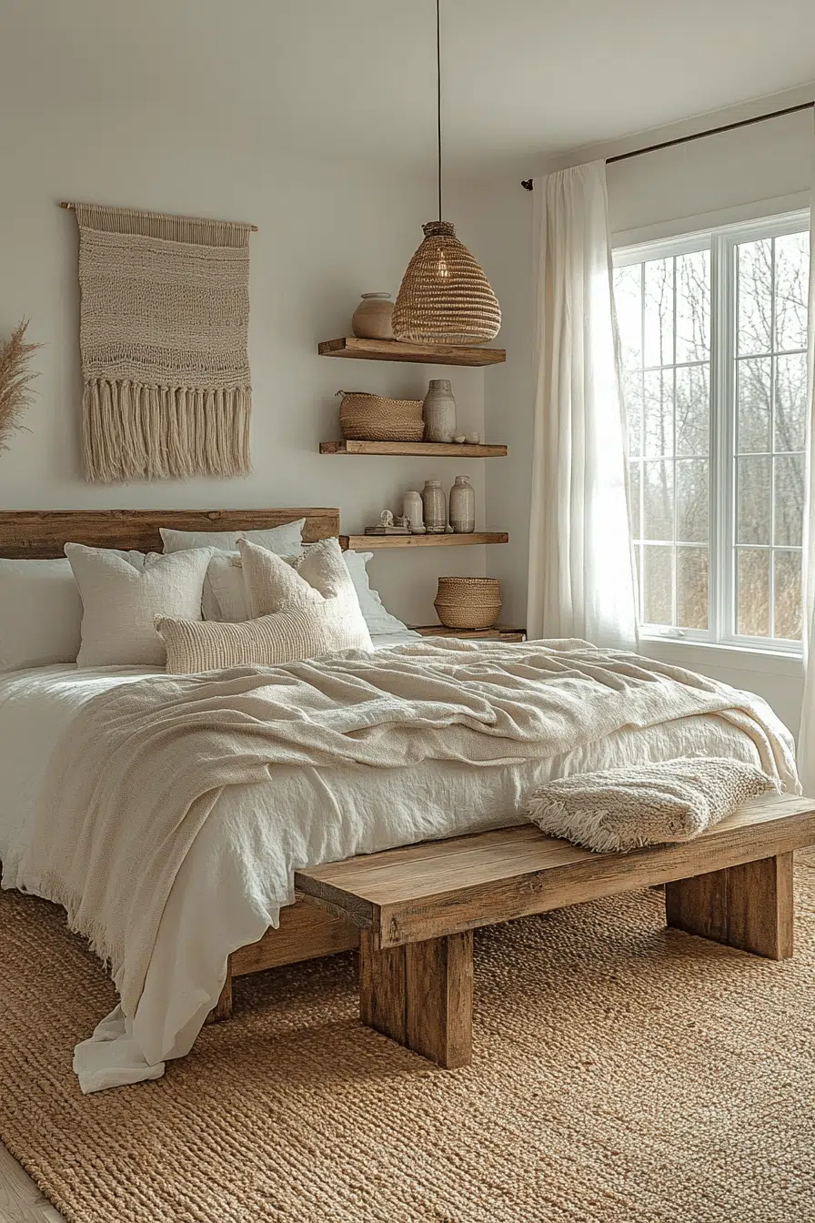 Neutral nest emphasizes a serene color palette in rustic boho bedroom ideas. Think whites, greys, and beiges layered with soft textures and minimal decor. Natural light plays a big role in keeping it feeling open. Pair with light wood and delicate boho details for balance. It’s a restful sanctuary with rustic elegance.