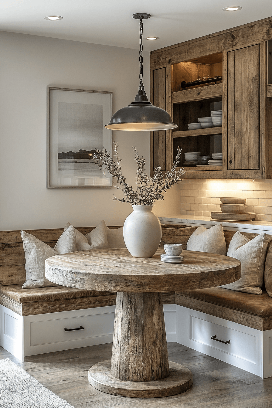 Seating areas integrated into the kitchen are inviting rustic kitchen features. Built-in benches or wooden stools enhance warmth. Neutral tones and soft lighting create intimacy. The layout balances practicality with comfort. Every detail emphasizes relaxation and gathering. Tap here to find cozy seating rustic kitchen inspirations.