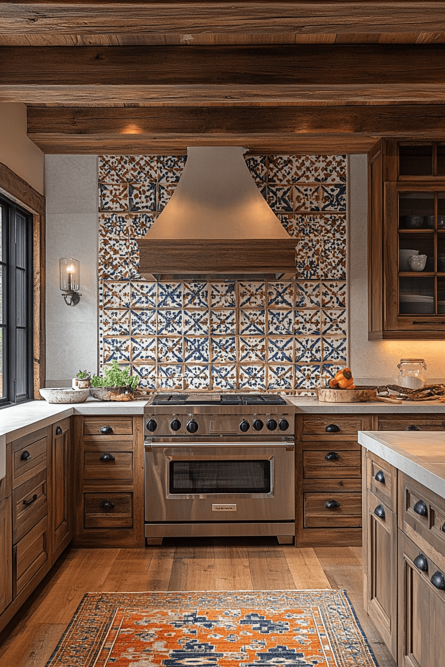 Tiles bring color and texture into rustic kitchen layouts. Patterned backsplashes contrast beautifully with wood cabinetry. Neutral walls keep the design cohesive. Lighting highlights the intricate tilework. The overall look balances practicality and charm. Tap here to discover tiled backsplash rustic kitchen inspirations.