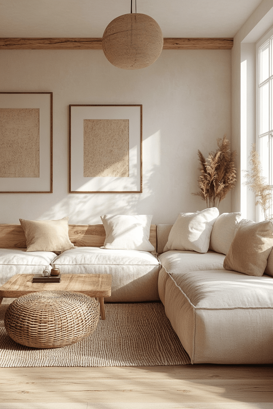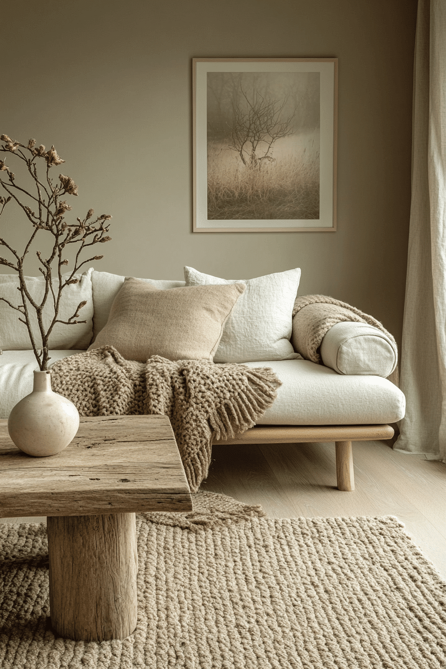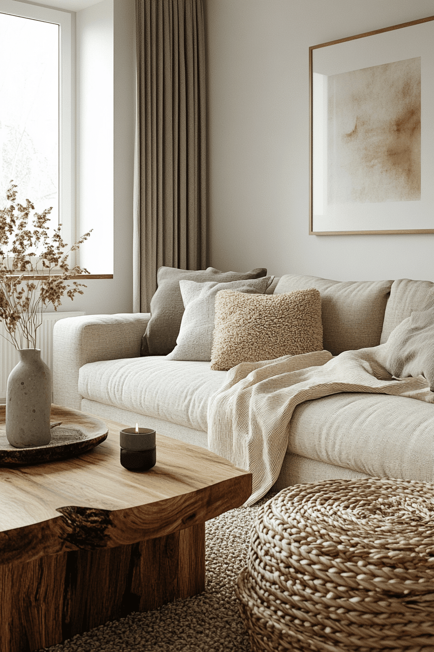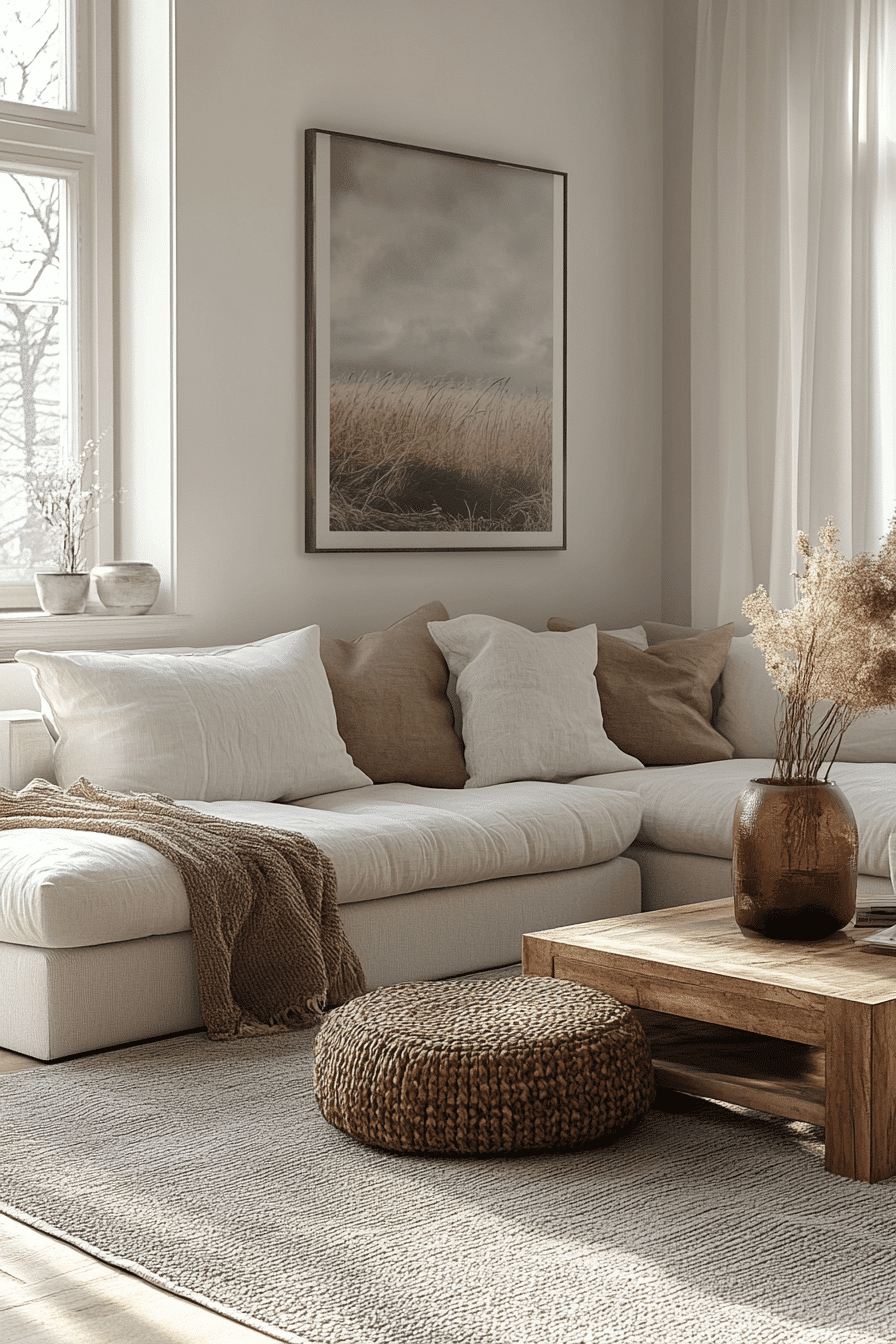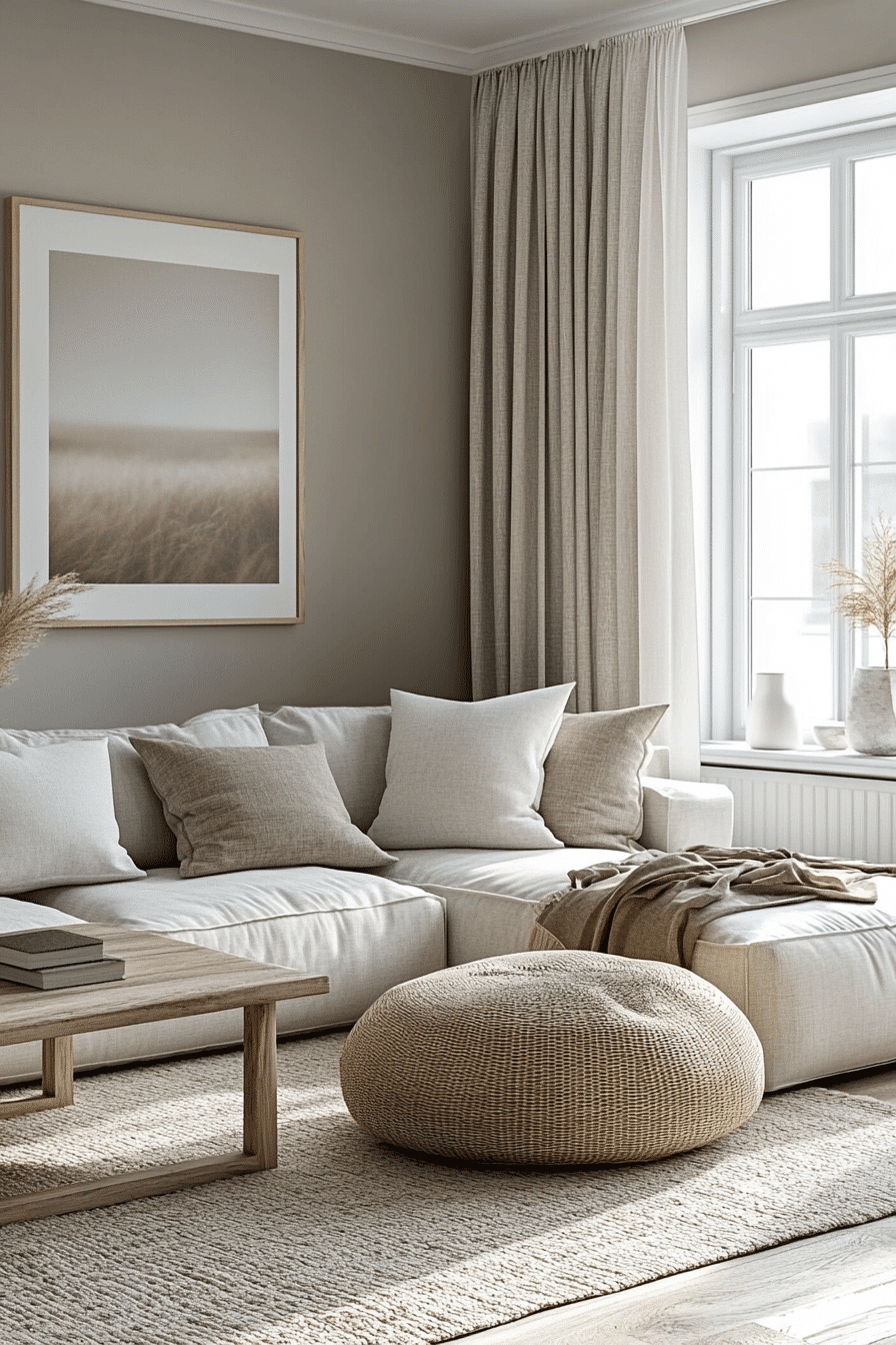 The Warm Neutrals Room envelops you in creamy whites, soft taupes, and sandy hues—an inviting Scandi living room palette. This look is grounded in light wood and plush textiles that create an environment of understated warmth. The key to this design is tonal layering, which brings depth without overwhelming the senses. Scandinavian decor thrives on harmony and this space achieves it through careful material choices. Minimalist art and warm lighting complete the look. Explore more warm Scandi living room ideas today.
