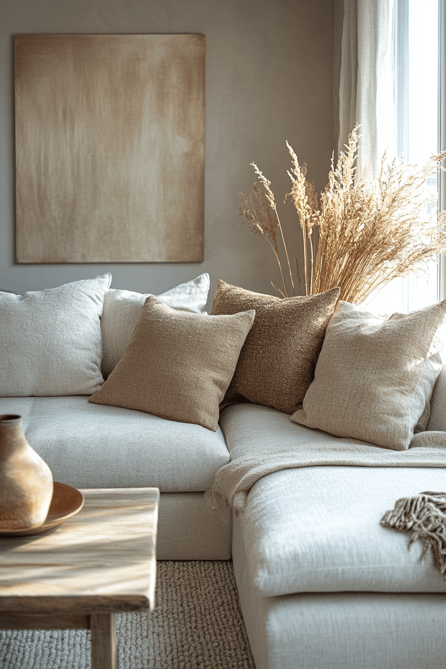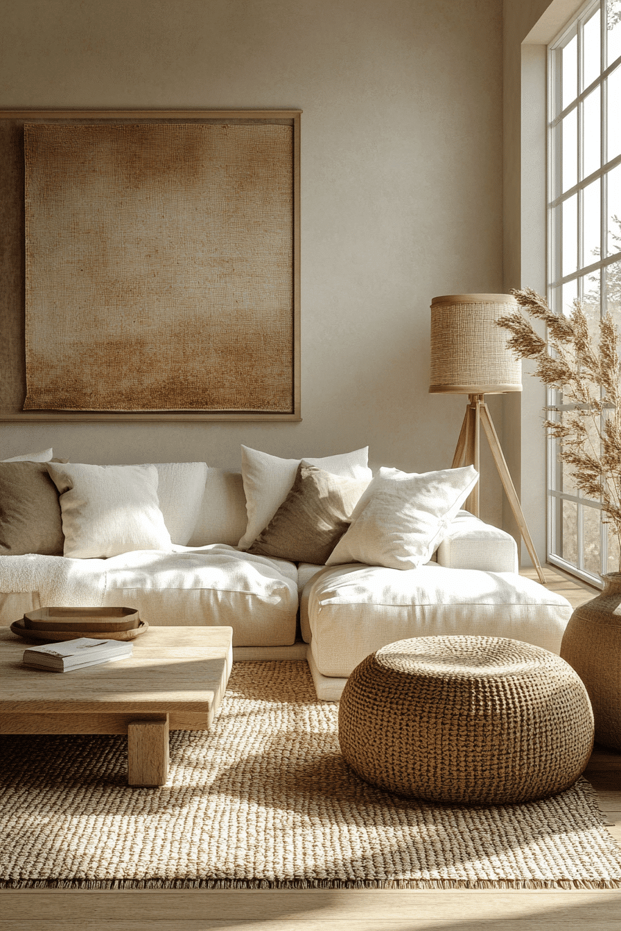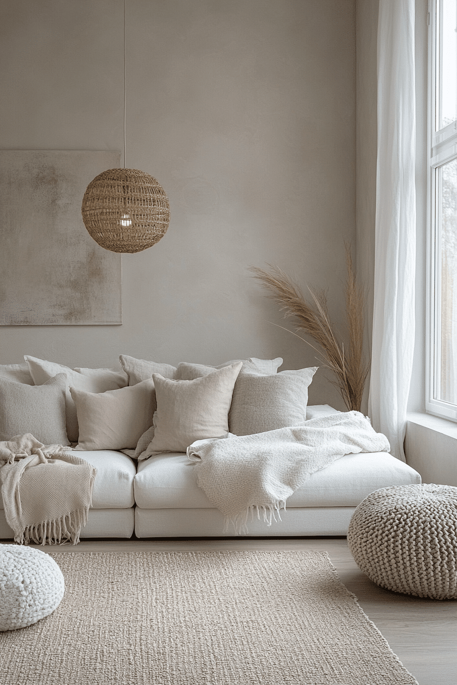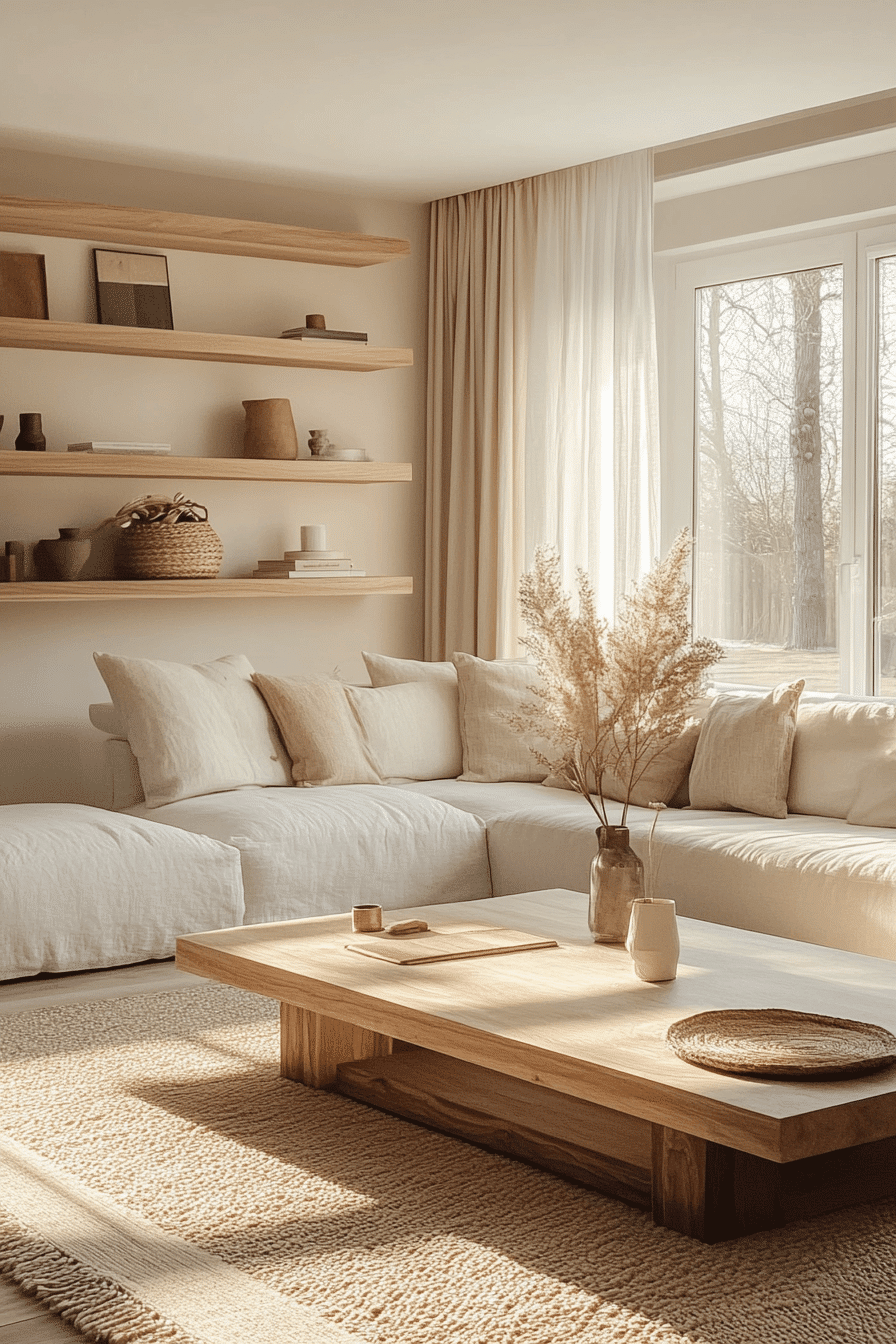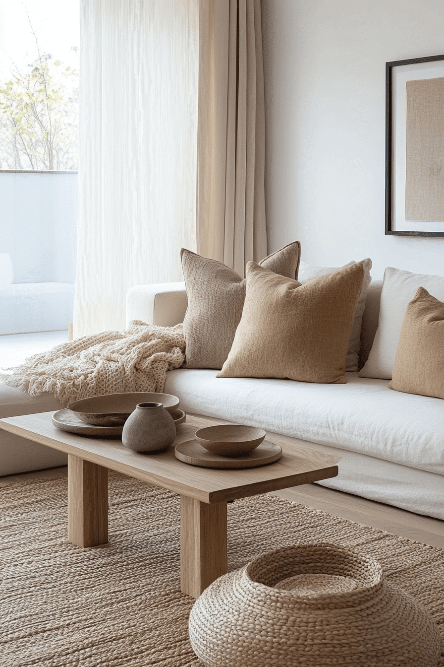 The Warm Neutrals Room envelops you in creamy whites, soft taupes, and sandy hues—an inviting Scandi living room palette. This look is grounded in light wood and plush textiles that create an environment of understated warmth. The key to this design is tonal layering, which brings depth without overwhelming the senses. Scandinavian decor thrives on harmony and this space achieves it through careful material choices. Minimalist art and warm lighting complete the look. Explore more warm Scandi living room ideas today.