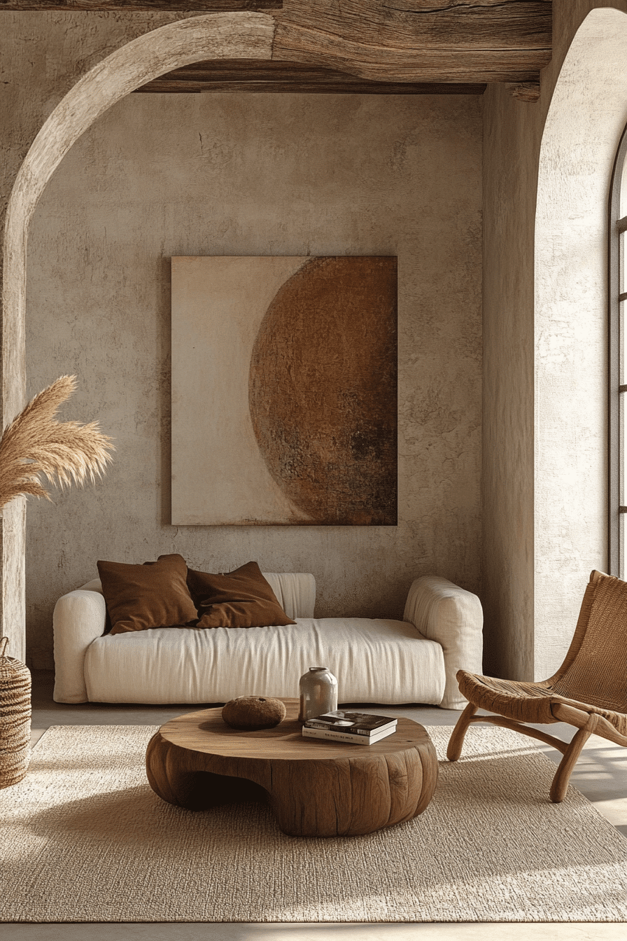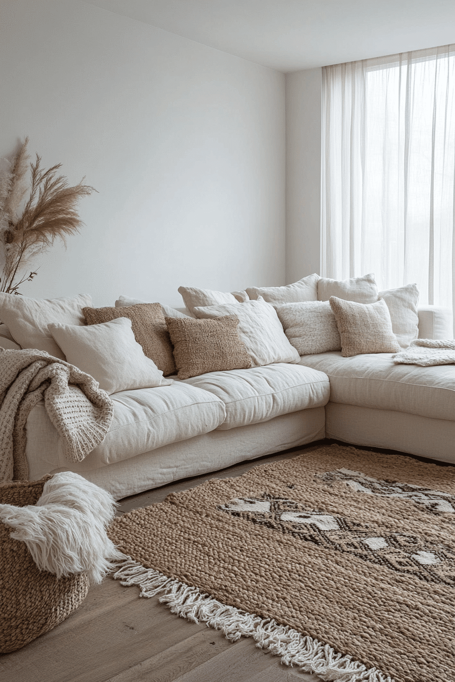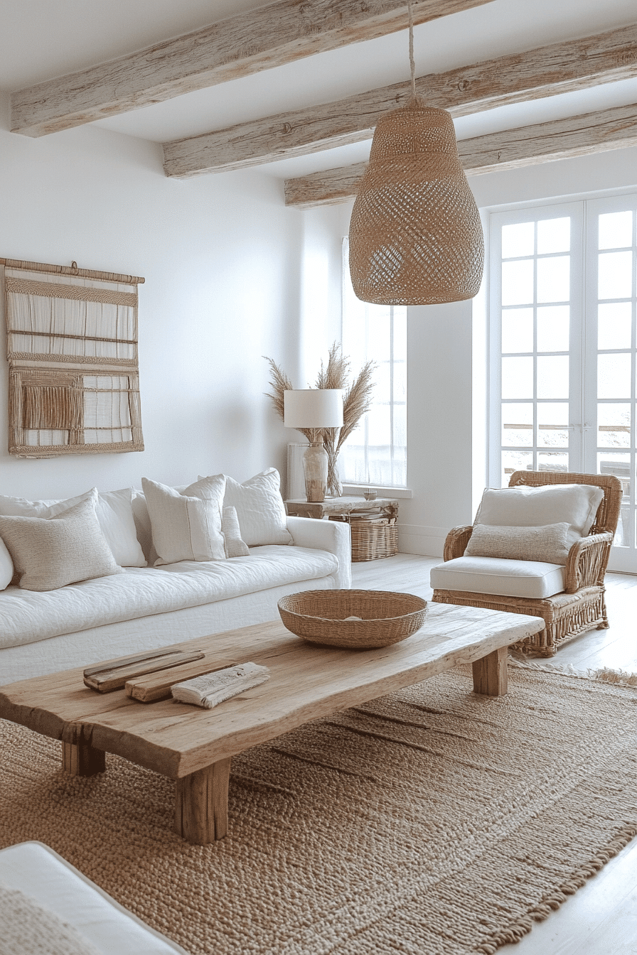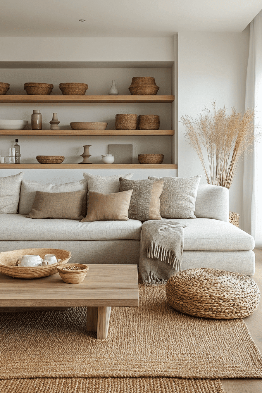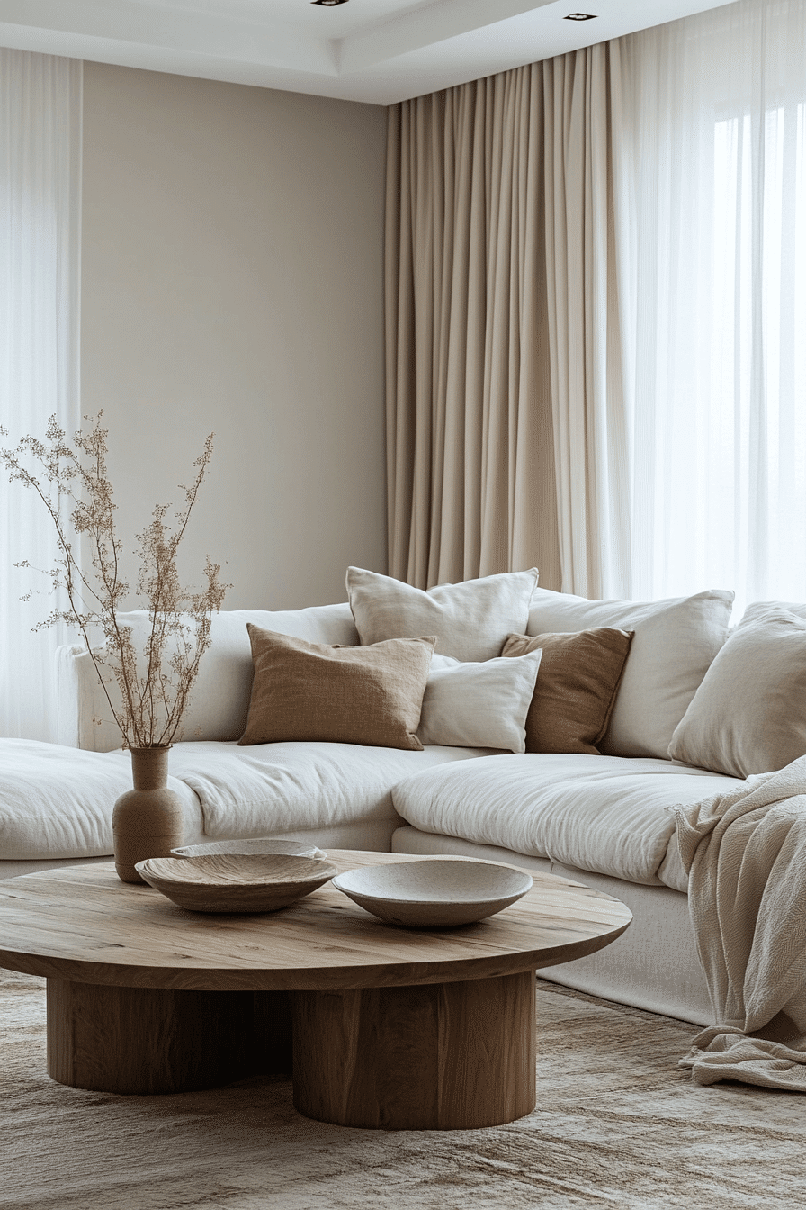 The Warm Neutrals Room envelops you in creamy whites, soft taupes, and sandy hues—an inviting Scandi living room palette. This look is grounded in light wood and plush textiles that create an environment of understated warmth. The key to this design is tonal layering, which brings depth without overwhelming the senses. Scandinavian decor thrives on harmony and this space achieves it through careful material choices. Minimalist art and warm lighting complete the look. Explore more warm Scandi living room ideas today.