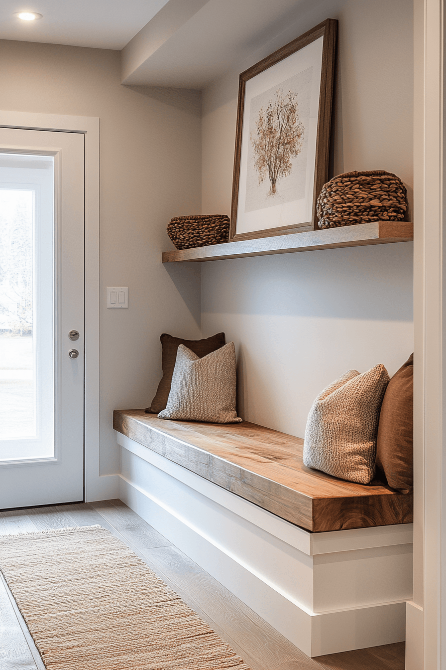 Floating Entry Magic makes use of creative wall-mounted elements. These small entryway ideas add floating shelves, benches, or hooks to save precious floor space. By lifting features off the ground, the area feels light and airy. It’s a smart way to keep things organized without crowding the room. The design proves small spaces can still feel modern and stylish. Click here to uncover more floating entryway solutions!
