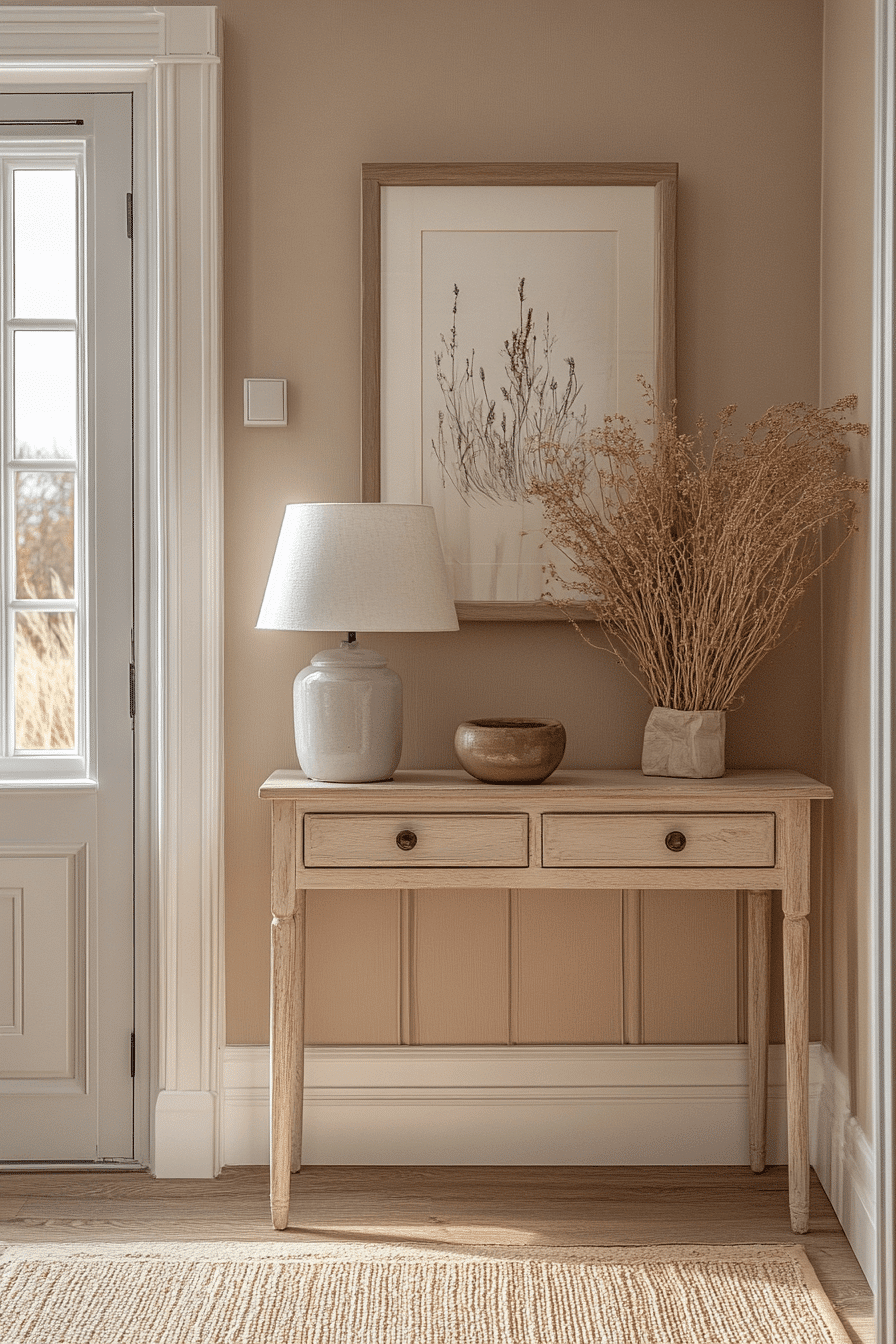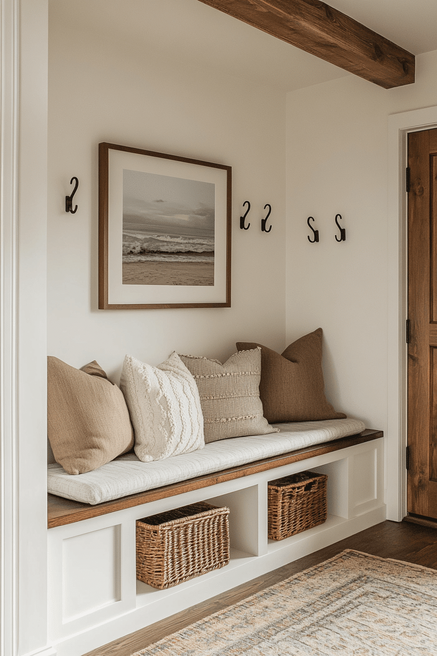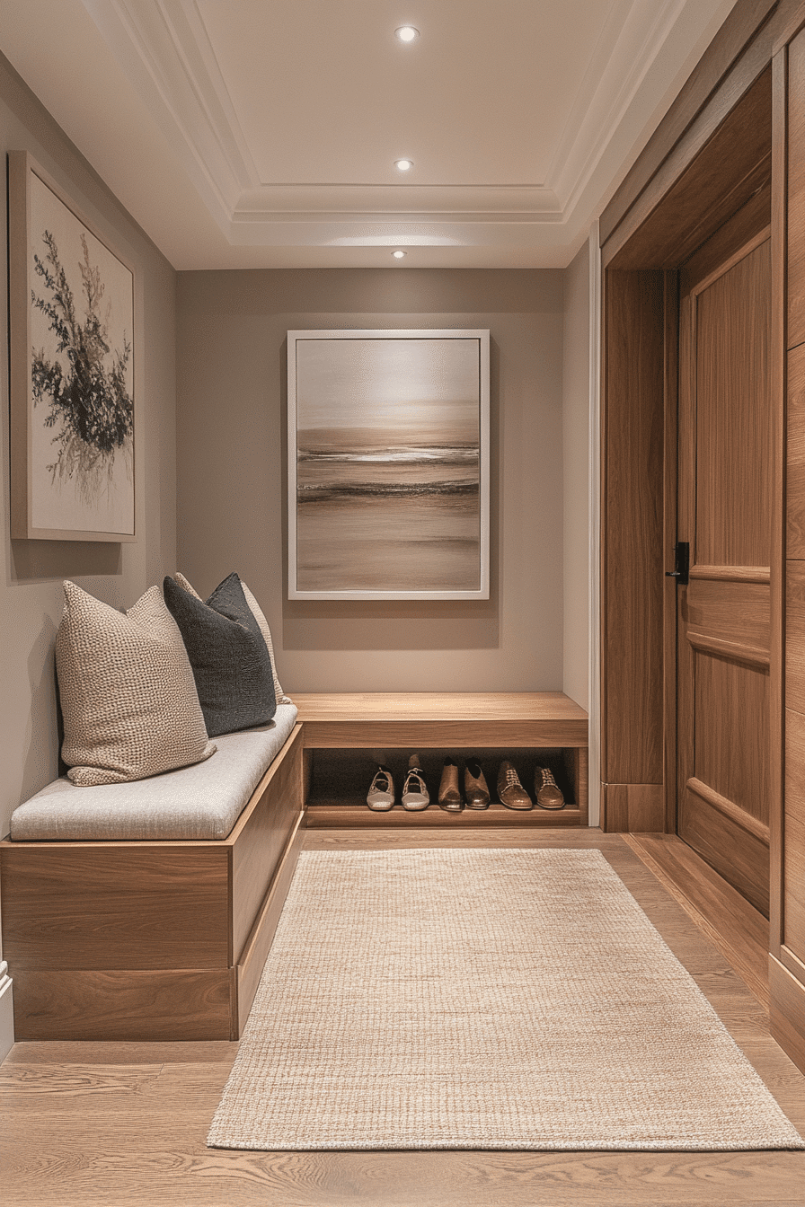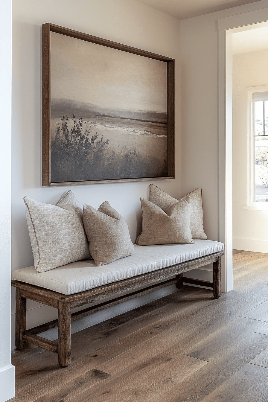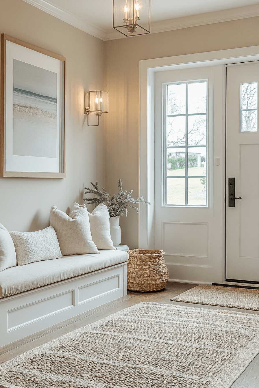 Neutral Entry Vibes show how calming tones can expand a small space visually. These small entryway ideas rely on soft beiges, whites, and greys to create an airy mood. Neutral palettes make everything feel open and cohesive. They also allow you to easily add accents without overwhelming the space. The vibe is timeless and adaptable. Click here to see more neutral entryway ideas that relax and inspire!