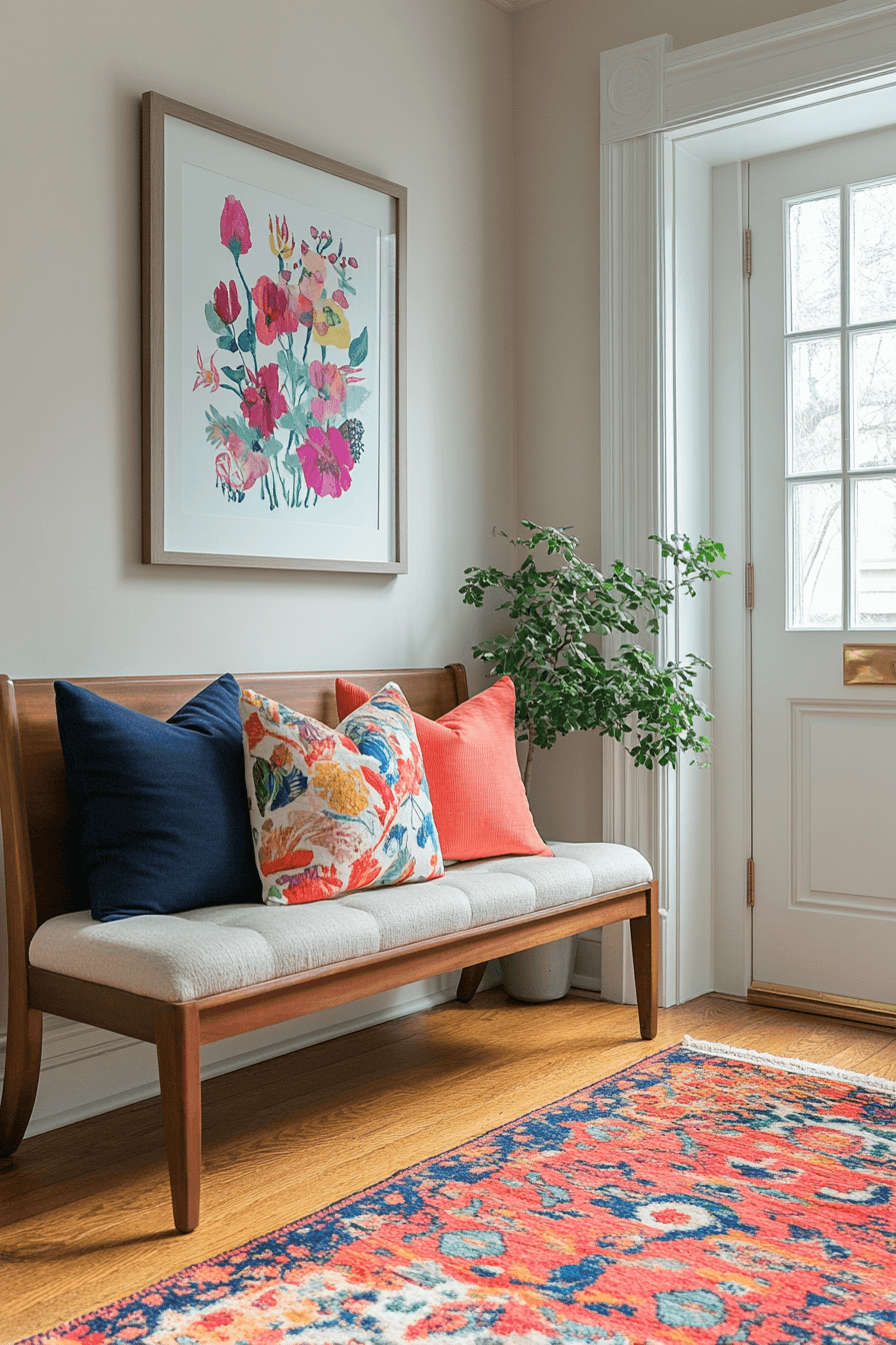 Colorful Entry Touches prove even a small space can shine with personality. These small entryway ideas include bright rugs, playful art, and cheerful accents. Pops of color energize the entryway and create a warm welcome. The key is balance—adding just enough color without overcrowding the design. Guests instantly notice the vibrance and joy. Tap now to see more colorful and fun entryway ideas!