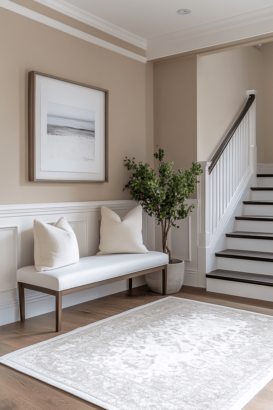 Neutral Entry Simplicity uses calm tones to create timeless appeal. These small entryway ideas rely on beige, cream, and grey shades to enhance space and light. Simple colors make it easy to layer in accents. The overall effect is calming and airy. Neutral palettes ensure flexibility with any décor. Click here to uncover more simple yet chic neutral entryway designs!