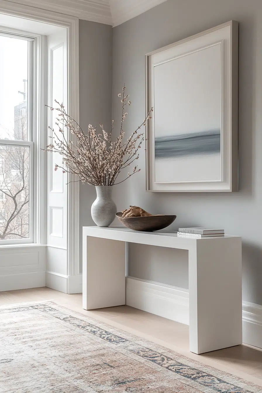 This serene entryway proves that less truly is more – the simple white console against soft gray walls creates an instantly calming first impression. The carefully curated styling with natural branches and a single wooden bowl shows how minimalism can still feel warm and welcoming.