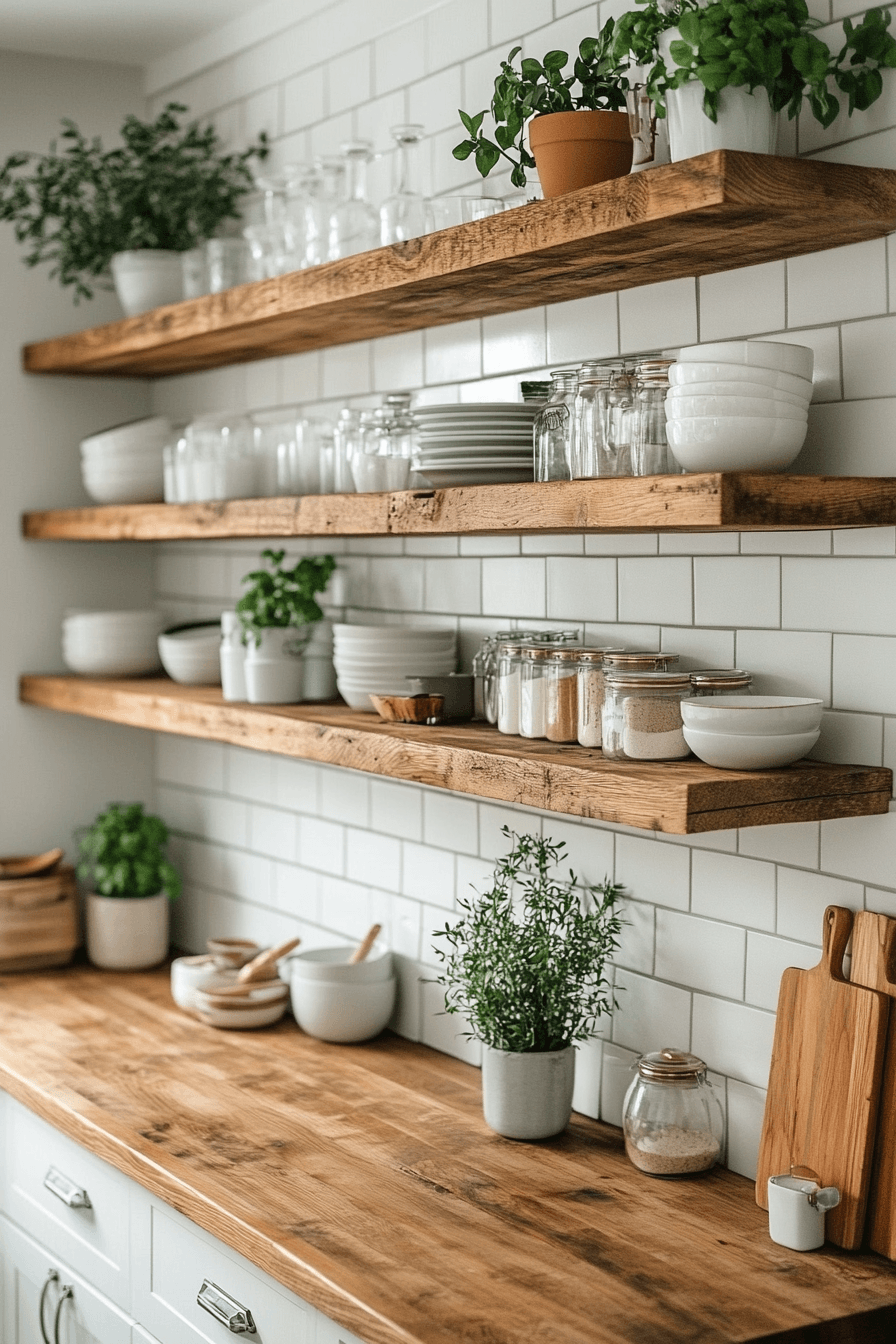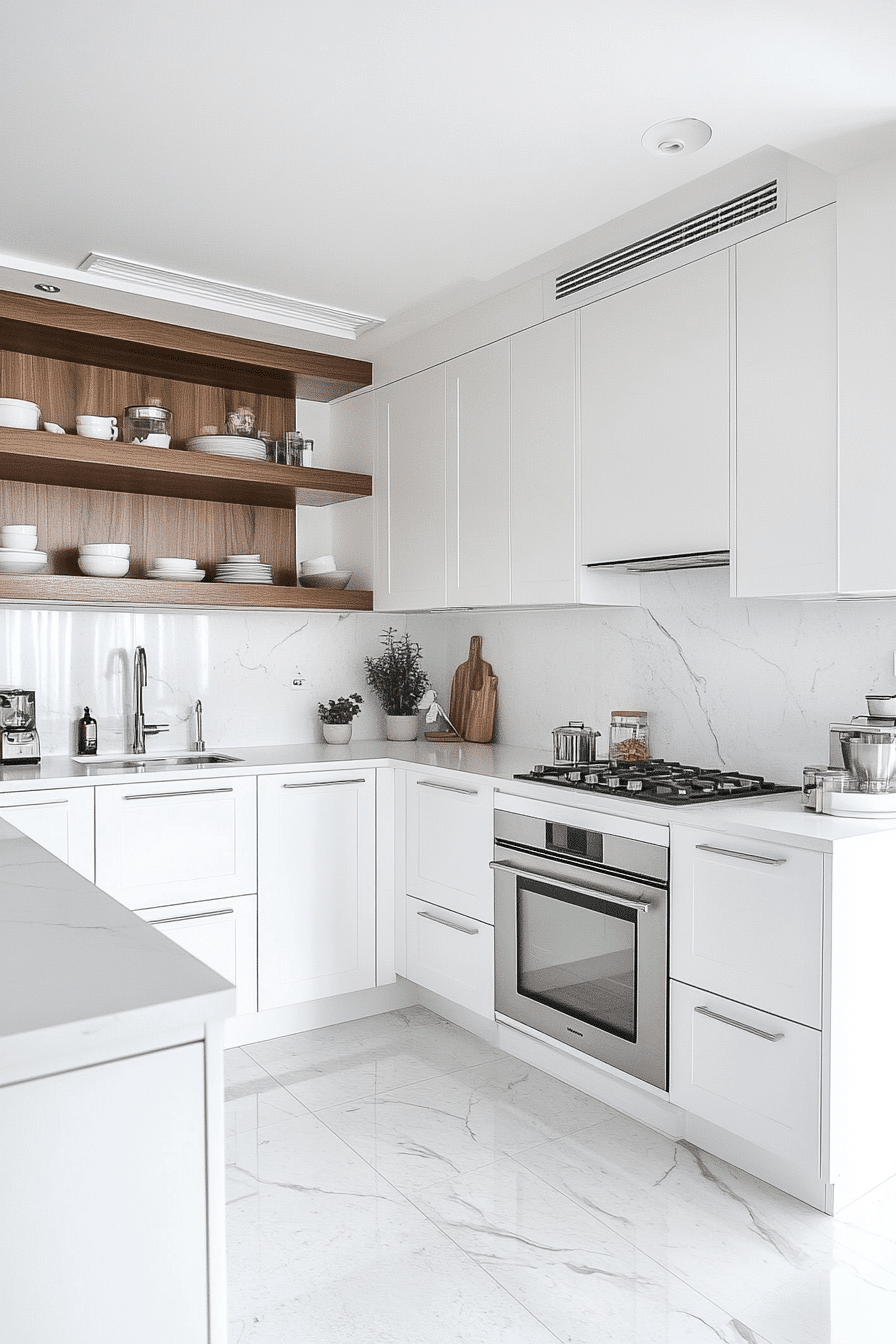 Open shelving gives small kitchen design an airy, accessible feel. Display your favorite dishes while keeping things practical. It reduces the need for upper cabinets, creating a sense of openness. Combined with minimalist styling, it’s a win for form and function. Keep clutter at bay and style on point. Click here for stylish shelf setups.
