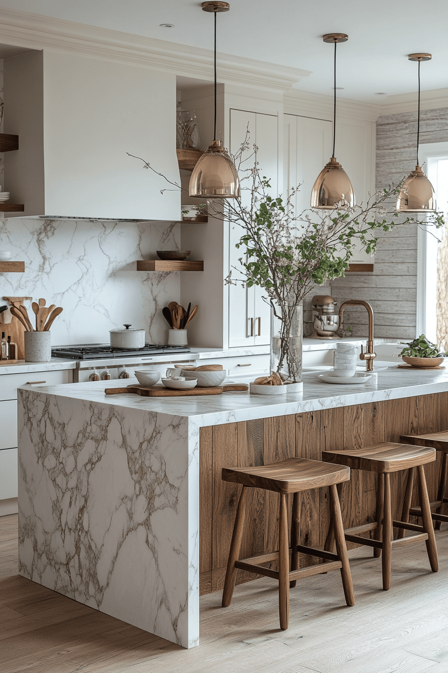 Marble details in small kitchen design add a refined, modern touch. A marble backsplash or waterfall counter makes a statement even in tiny square footage. Its natural veining adds movement and softness. Paired with minimalist cabinets, it elevates the space effortlessly. This look blends classic materials with modern efficiency. Click now to explore elegant kitchen solutions.