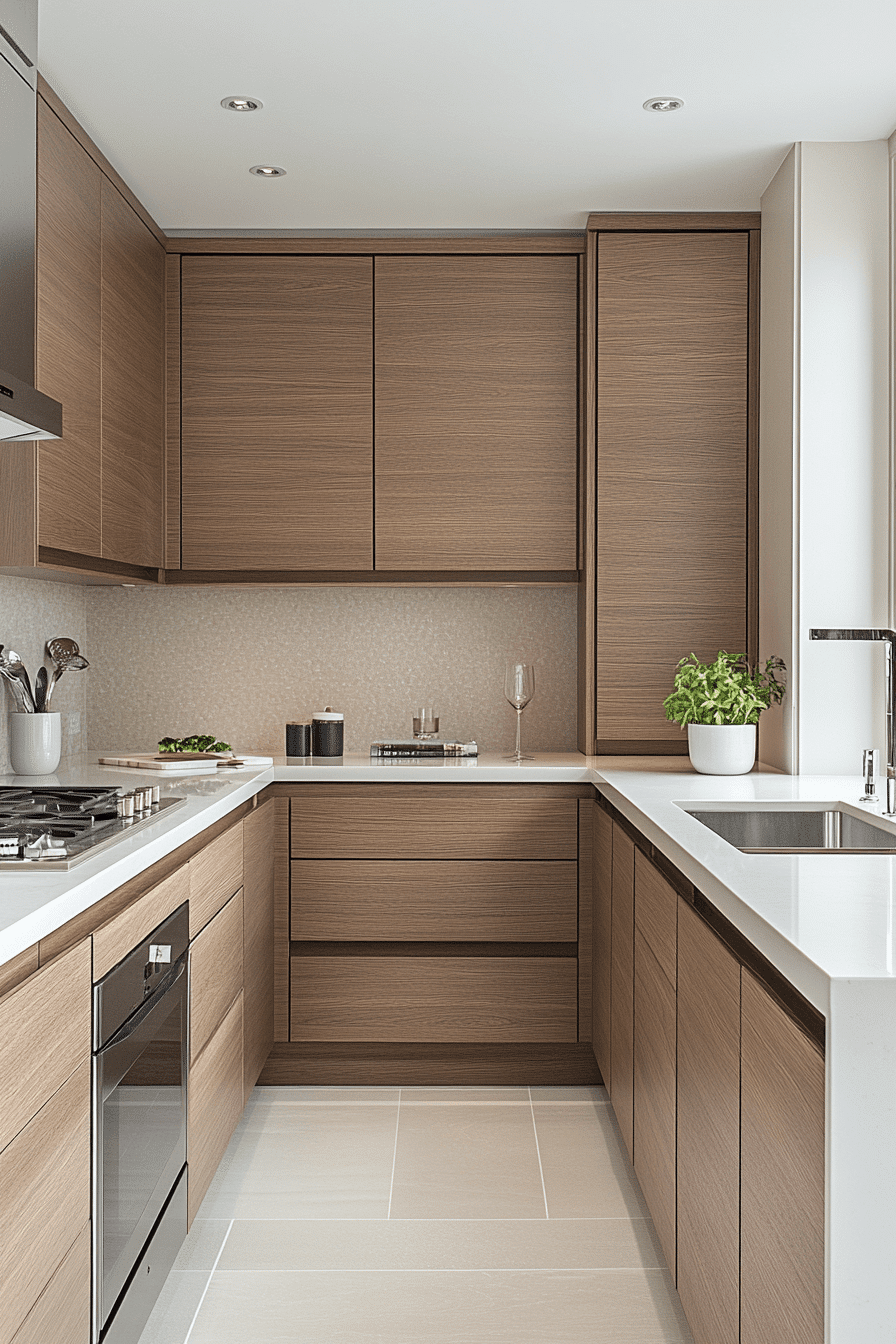 Natural wood tones add warmth and richness to small kitchen design. Think butcher block countertops or light oak cabinetry. These organic touches soften a modern kitchen and make it feel more inviting. Warm woods pair beautifully with whites or grays. The result is cozy and fresh. Explore more wood-accented kitchens here.
