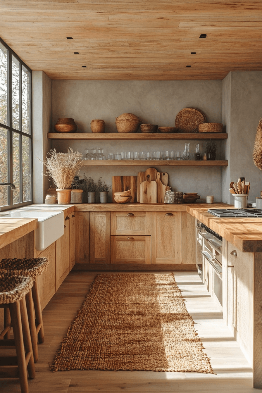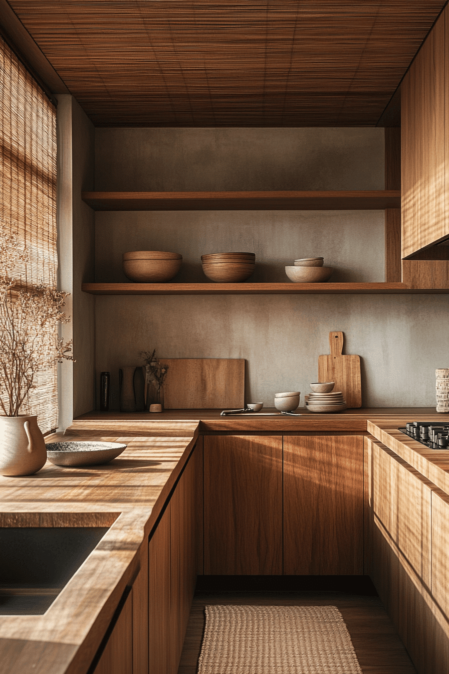 Japandi small kitchen design blends Japanese elegance and Scandinavian functionality. Neutral tones, natural materials, and low-profile furniture define this calming space. Floating shelves and soft lighting maintain an open and serene aesthetic. The focus on mindful, purposeful design makes every corner count. It’s a minimalist retreat for cooking and calm. Ready to revamp your space? Click now.