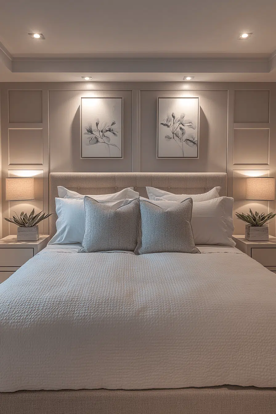 Corner Comfort optimizes every inch of space by placing key furniture in overlooked corners. This small master suite layout uses angled positioning to make the room feel cozy yet functional. Floating nightstands and tucked-away lighting enhance the intimate feel. Light colors and layered bedding complete the restful vibe. The corner setup creates a calm and practical sleeping nook.