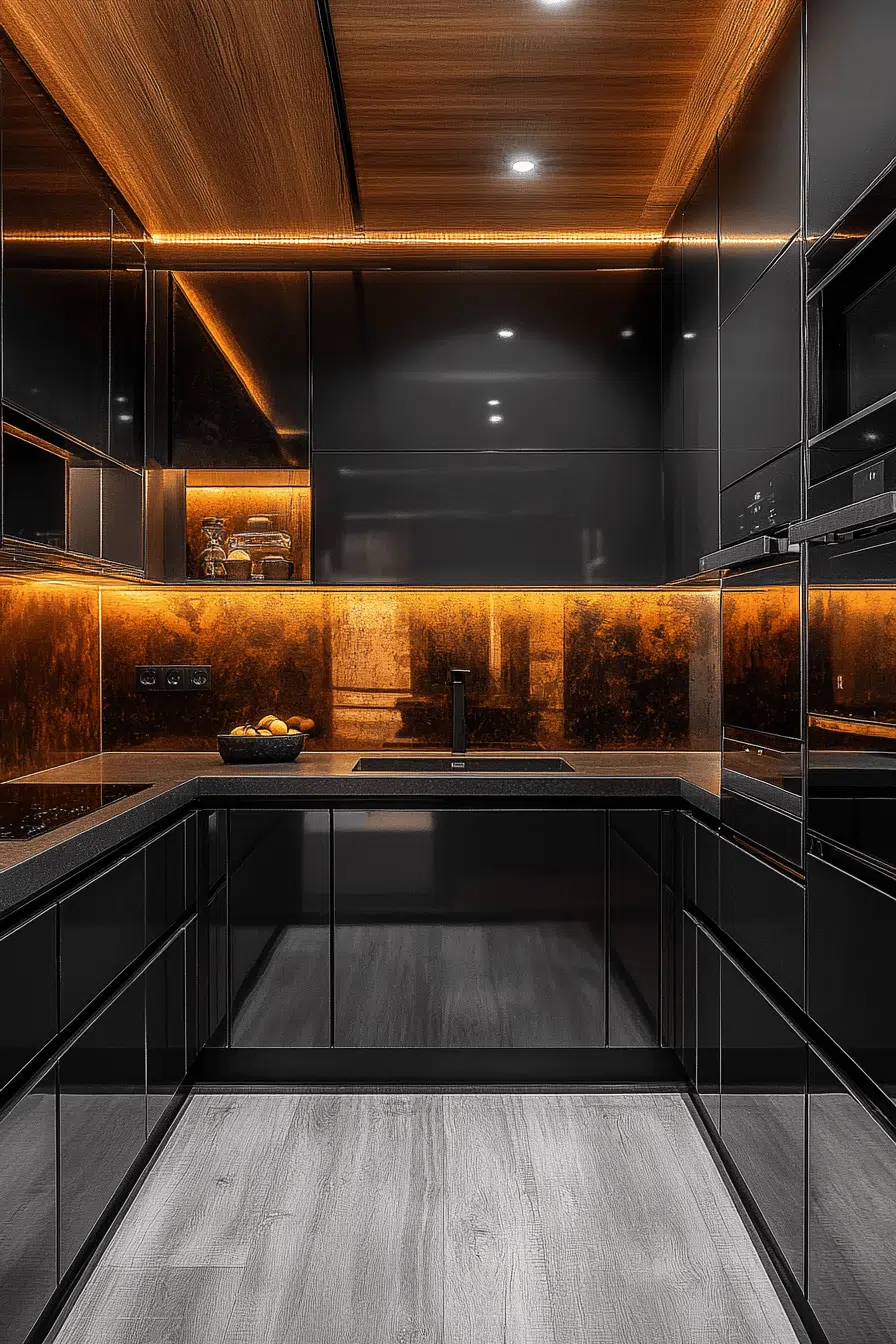 The Noir Haven Kitchen makes use of jet black hues to establish a sophisticated and intimate small moody kitchen. This design focuses on creating a cohesive look with uniform color and texture, from the cabinetry to the appliances. Soft, indirect lighting enhances the ambiance without overpowering the dark tones. This approach is perfect for those who desire a minimalist yet dramatic kitchen.