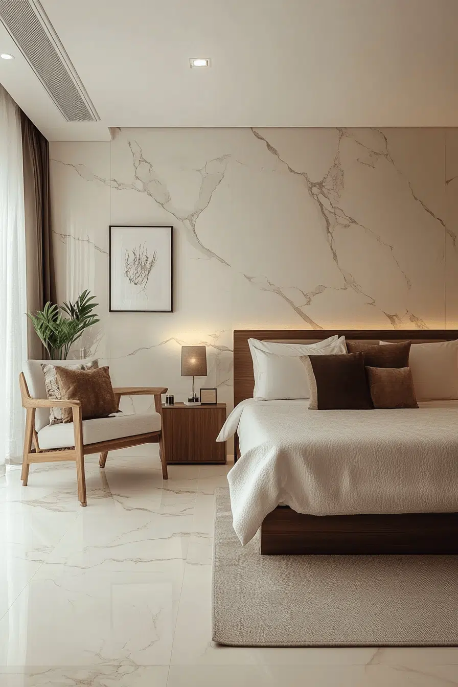 The Majestic Marble Mantle bedroom revolves around a marble stone wall that exudes luxury and timelessness. Marble’s distinctive veining and deep colors create a regal and sophisticated backdrop for sleeping quarters. This stone wall bedroom design is complemented by high-end furnishings and classic decor to match the grandeur of marble. The natural coolness of marble helps maintain a comfortable sleeping environment, merging beauty with functionality.