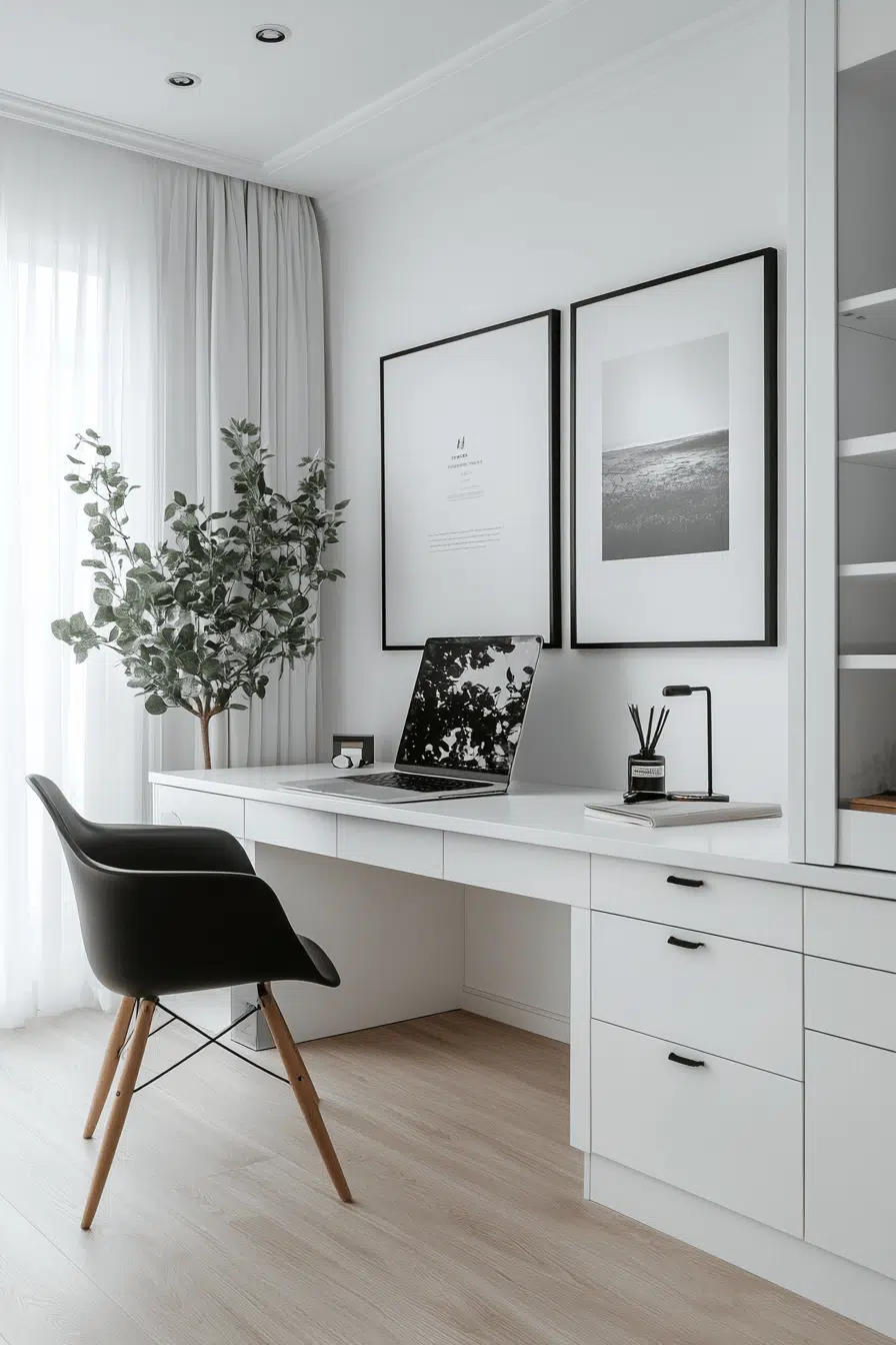 ✨ Pro Tip: Float two oversized black-framed prints at eye level above your desk—keep the art monochrome and the frames thin to maintain that airy, gallery-wall feel without visual weight.