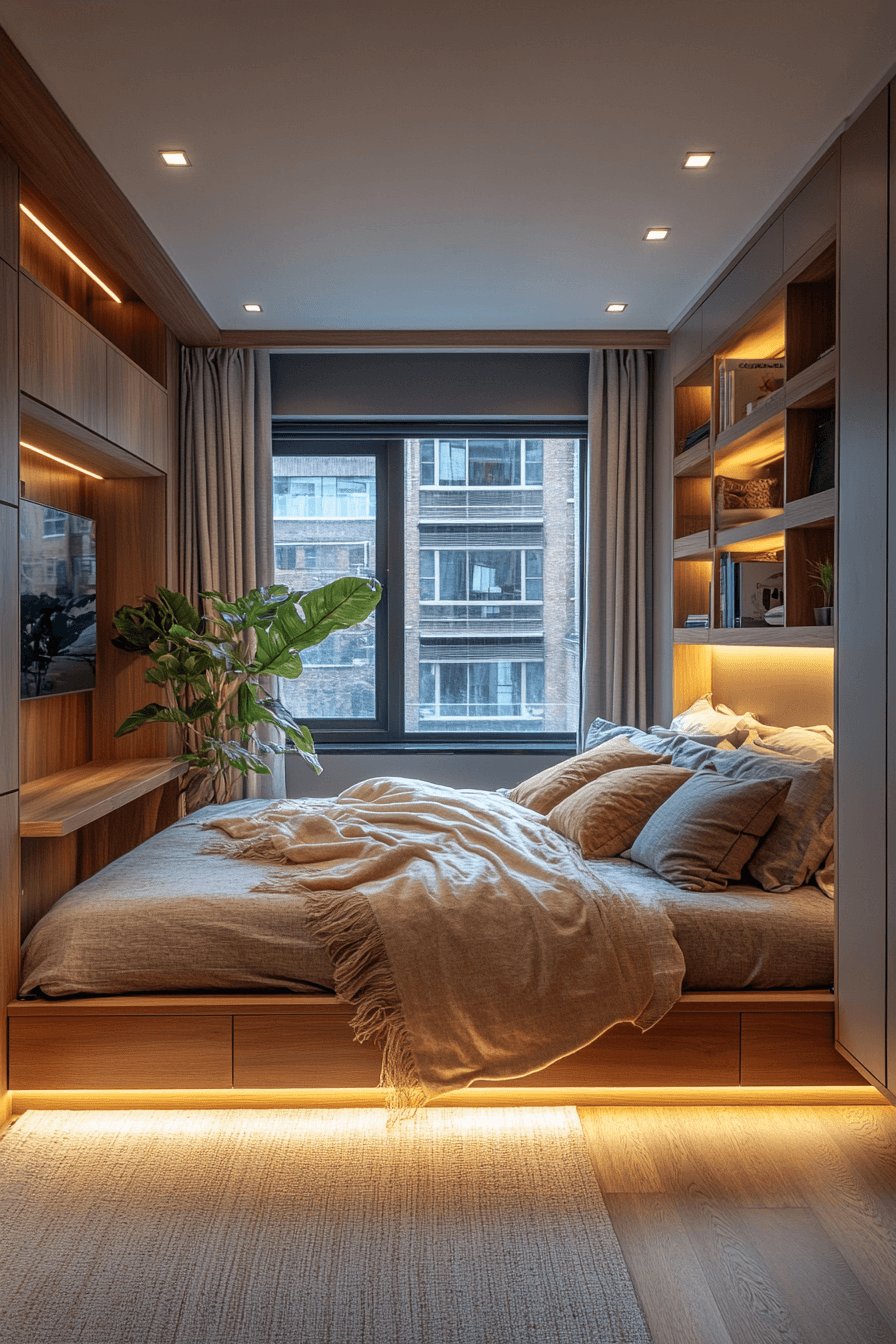 Storage is key to making tiny apartment ideas functional and stylish. Built-in drawers, under-bed compartments, and floating shelves keep essentials tucked away. Neutral palettes prevent storage-heavy spaces from feeling crowded. Sleek finishes on storage units add elegance without bulk. These tiny apartment ideas prioritize organization without losing charm. Click here to see more hidden storage inspirations.