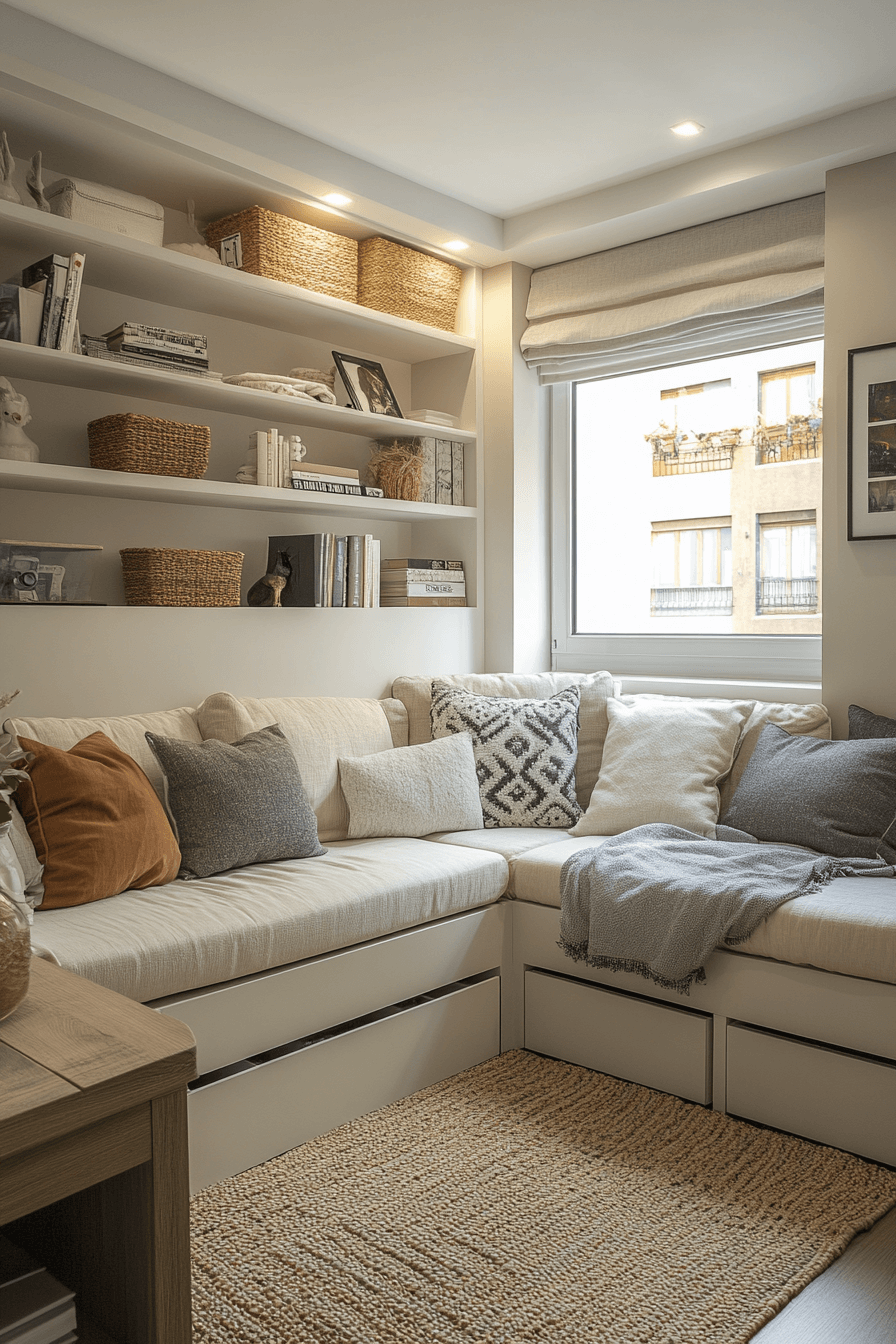 Tiny apartment ideas shine when corners are used effectively. Built-in seating nooks, corner shelves, and compact desks make underused areas functional. Light color palettes open up tight spaces without feeling crowded. Layered textiles bring comfort while still keeping layouts minimal. This design approach makes every corner count beautifully. Click now to see more clever corner solutions.