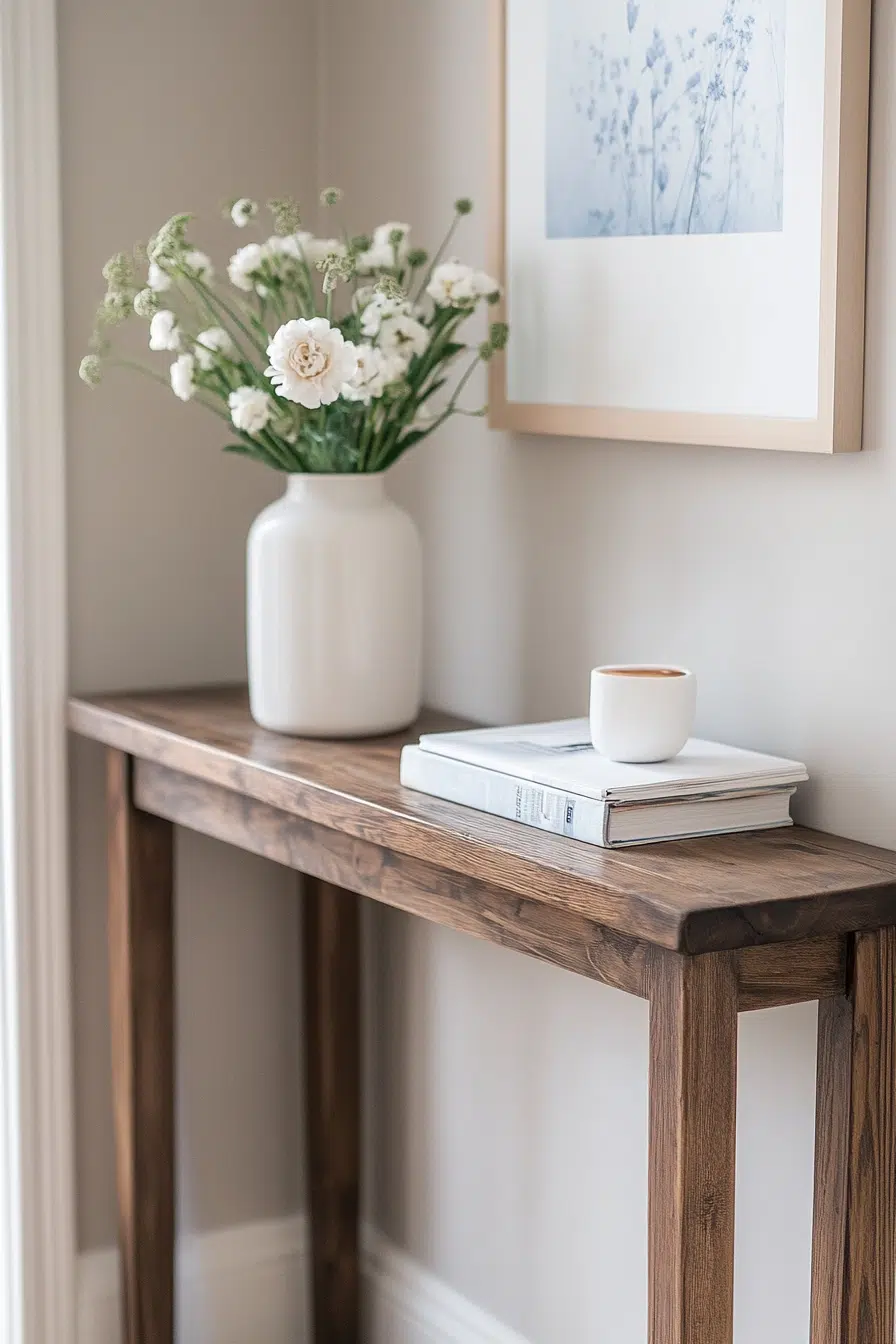 - Furniture: Slim console table with lower shelf, 10-12 inches deep, light wood or white finish