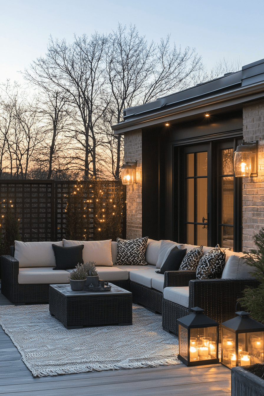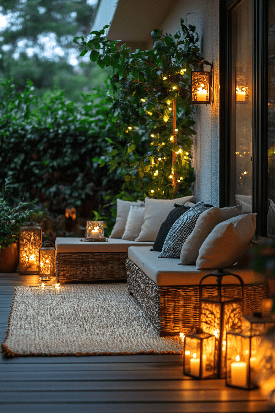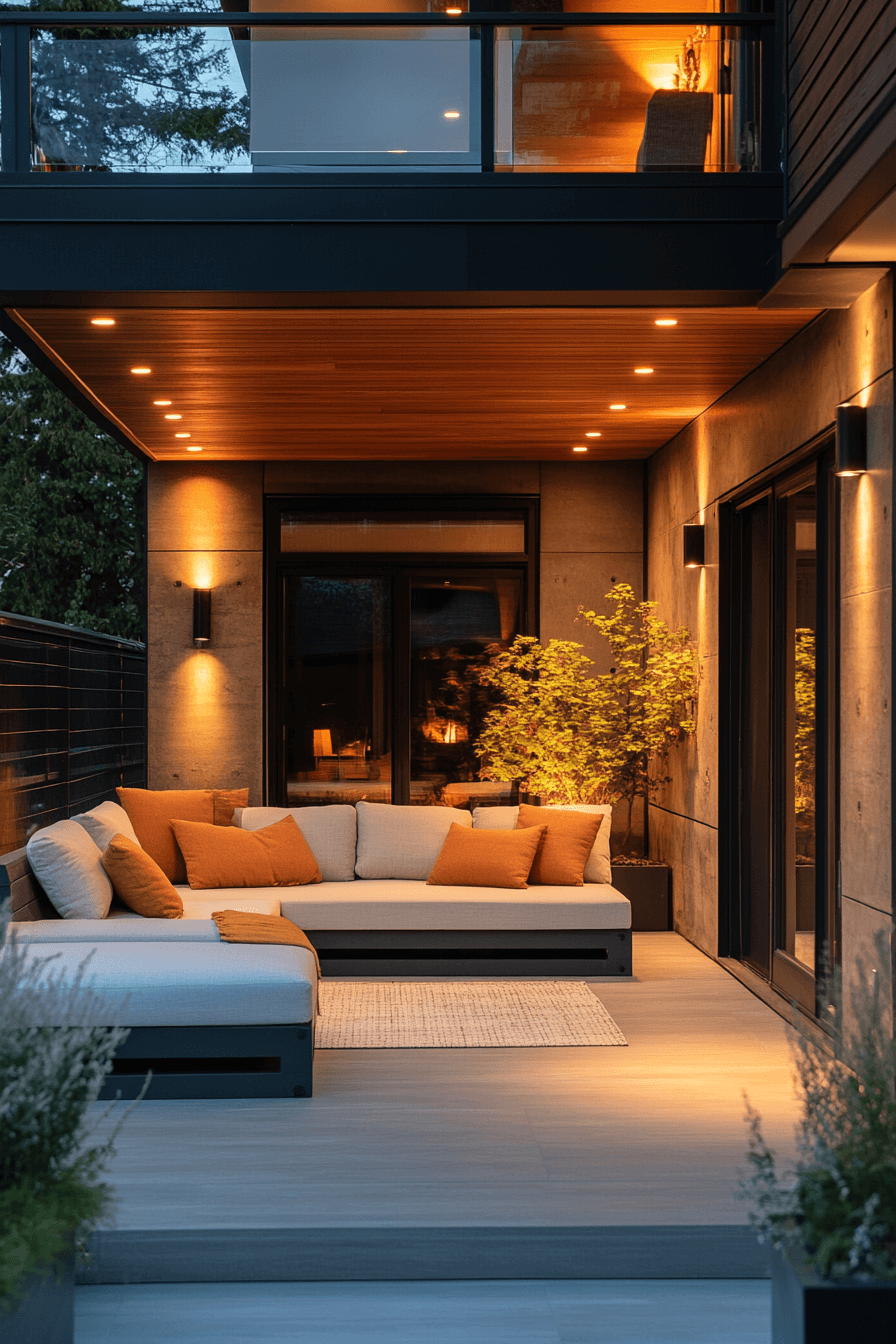Lighting sets the mood, and stylish tiny patio ideas highlight how it transforms compact spaces. Lanterns, sconces, or subtle string lights create ambiance without overwhelming. Neutral seating and layered rugs ensure comfort. Reflective finishes expand brightness and elegance. This design captures coziness with a polished glow. Click here to find more patio glow inspirations.