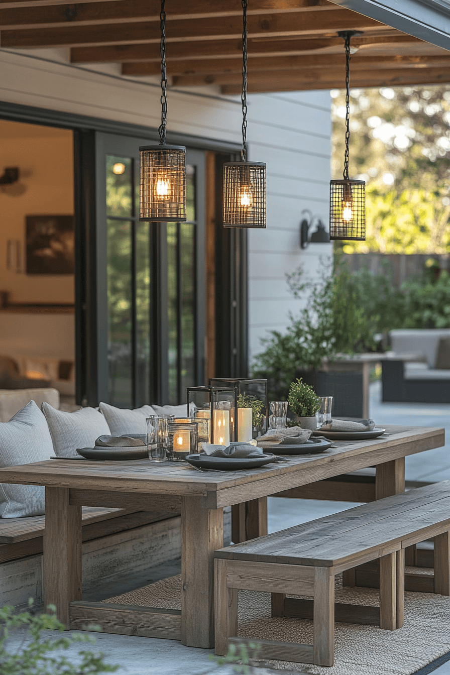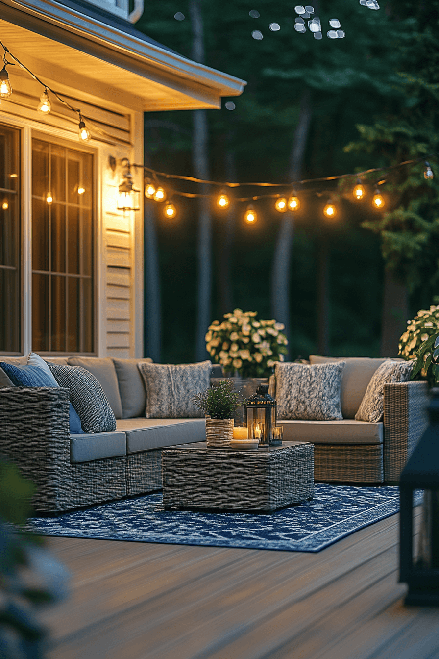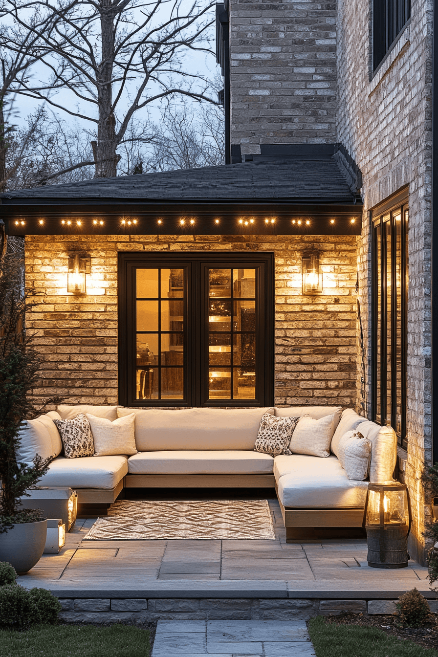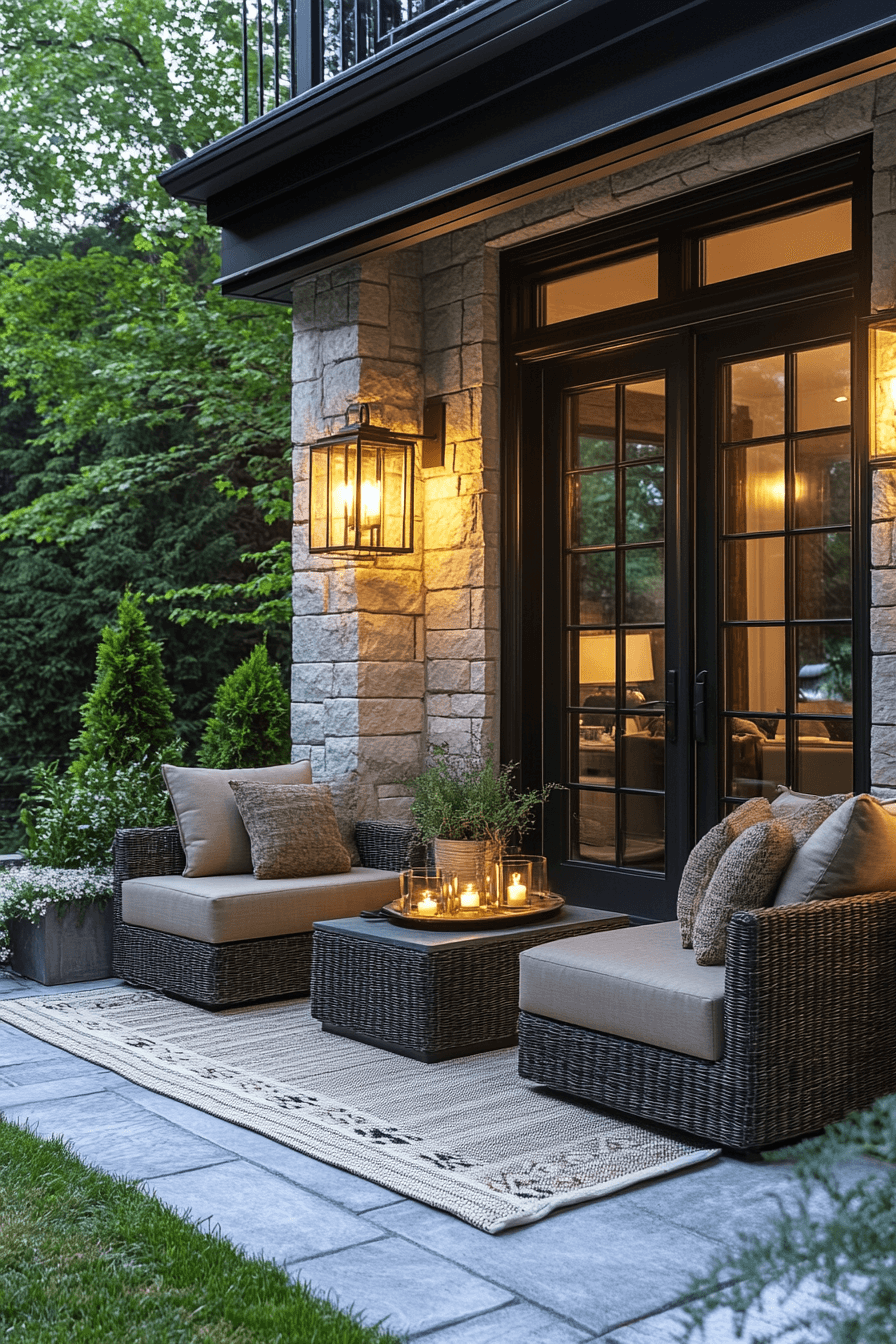 Lighting sets the mood, and stylish tiny patio ideas highlight how it transforms compact spaces. Lanterns, sconces, or subtle string lights create ambiance without overwhelming. Neutral seating and layered rugs ensure comfort. Reflective finishes expand brightness and elegance. This design captures coziness with a polished glow. Click here to find more patio glow inspirations.