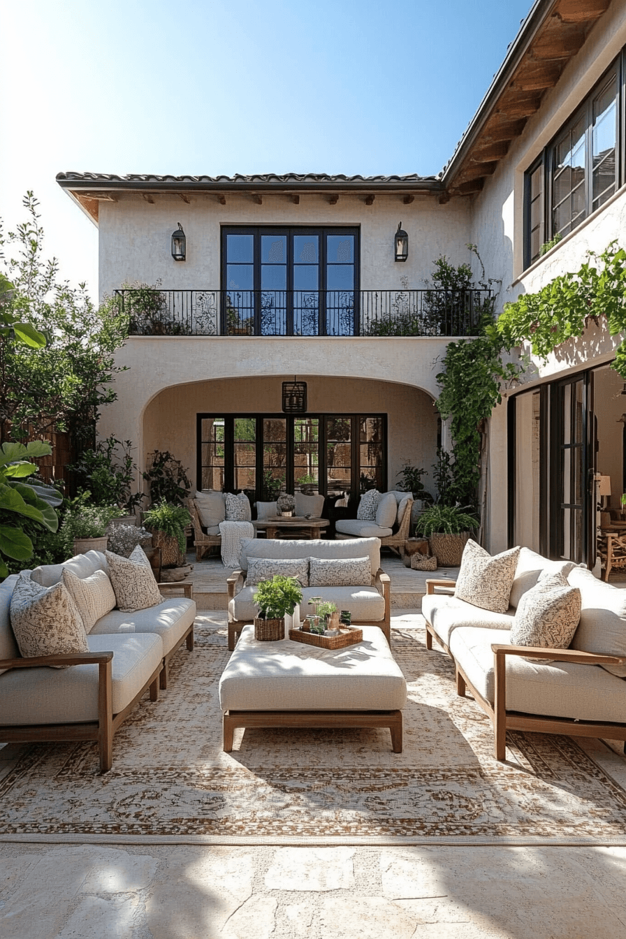 Luxe details elevate compact spaces, making tiny patio ideas feel more glamorous. Soft velvet cushions, metallic finishes, and polished flooring add instant sophistication. Subtle lighting enhances the luxurious vibe without overpowering the space. Neutral backdrops ensure the refined touches remain cohesive. This design approach proves that even small patios can radiate elegance. Click here to explore more luxe patio touches.