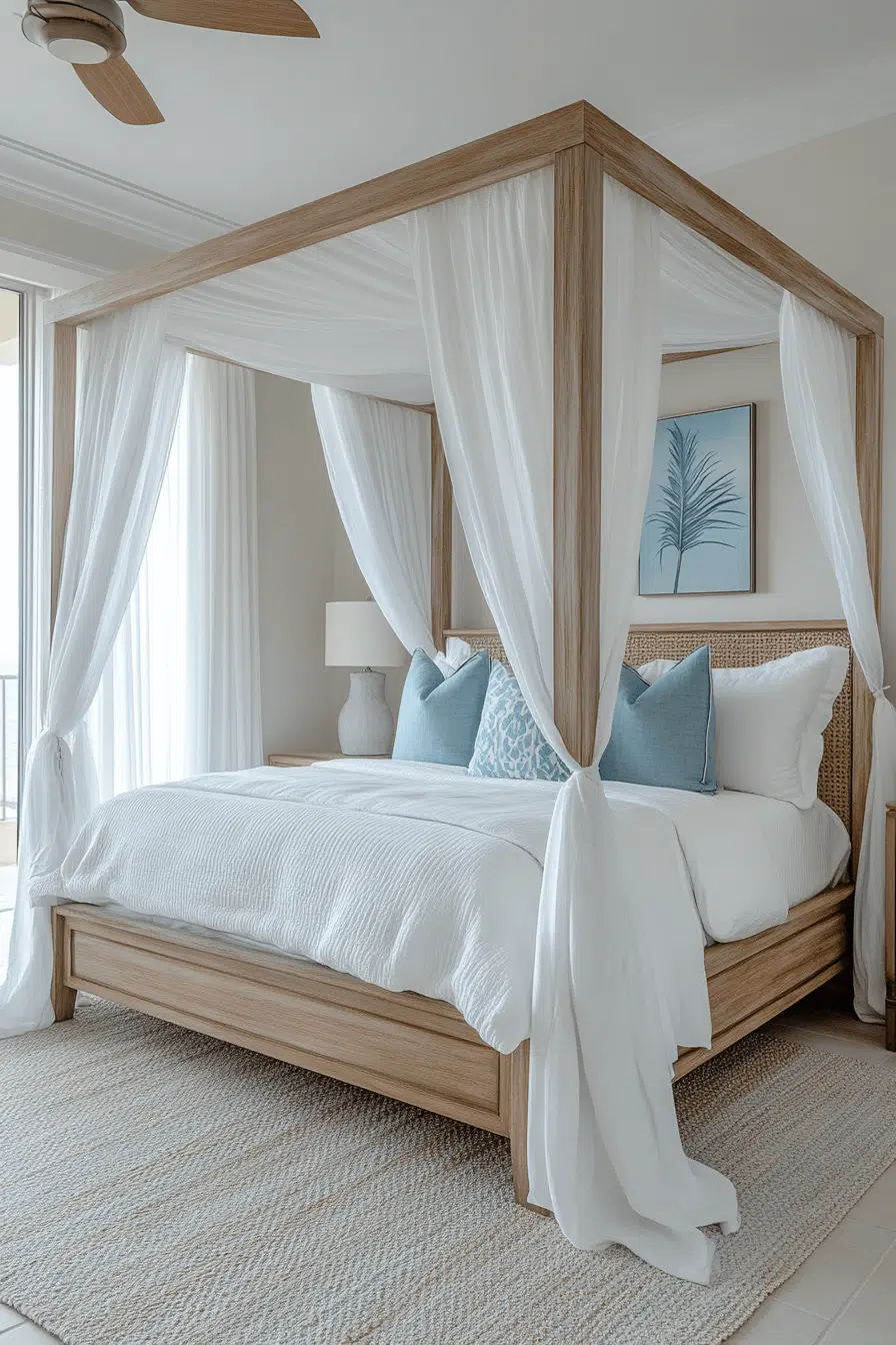 Seashell Soft Room tropical bedrooms incorporate the gentle colors and textures of seashells. Pale pink, soft beige, and light gray tones create a delicate, feminine palette that is soothing and inviting. Textures in bedding and curtains are subtle but tactile, reminiscent of the smoothness of shells. This bedroom design is ideal for those who appreciate the soft, subtle beauty of the seashore.