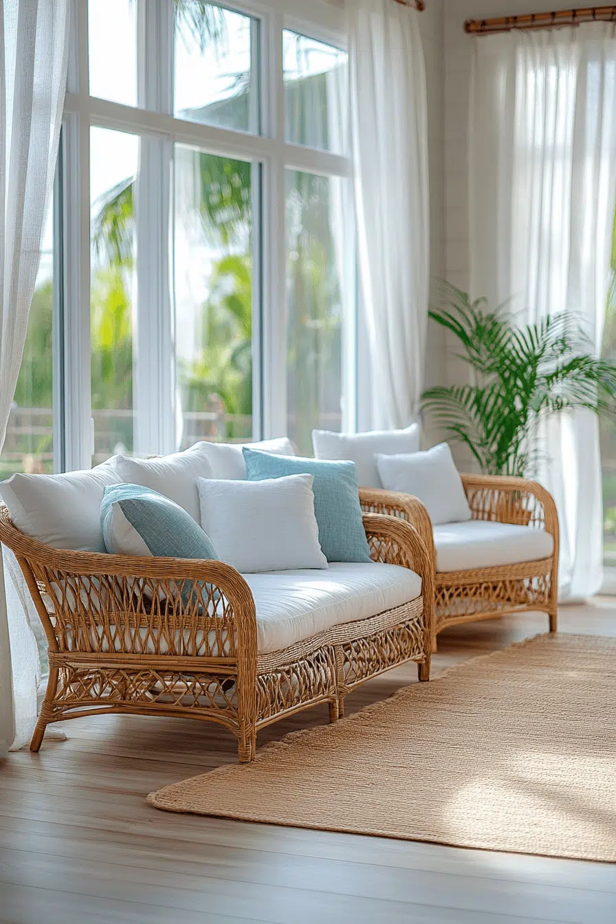 Coastal Haven focuses on creating a light, airy tropical living room that captures the essence of coastal living with whites and soft beige tones. Natural materials like light wood, jute, and linen dominate, providing a connection to the natural world outside. Accents of pale blue and green reflect the colors of the sea and sky, enhancing the peaceful atmosphere. This space is designed for relaxation and ease, perfect for a laid-back lifestyle.