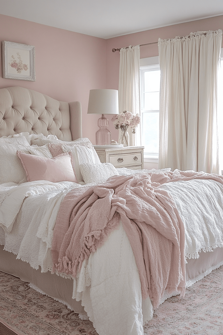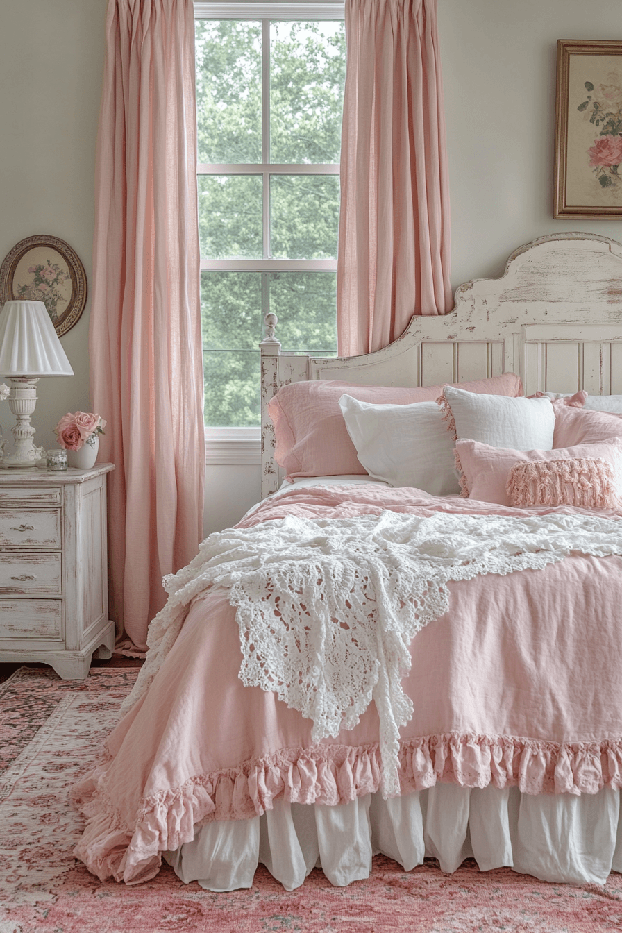 A faded rose palette creates a dreamy and romantic atmosphere in a vintage shabby chic bedroom. Soft rose-toned bedding, worn-in wallpapers, and blush accents bring subtle color without overwhelming the space. These hues feel timeless and effortlessly feminine, making the room calm and inviting. Distressed white furniture and lace curtains pair beautifully with faded rose tones. The gentle contrast between warm and pale textures enhances the vintage charm. Tap to explore more faded rose bedroom ideas that feel like a retreat.