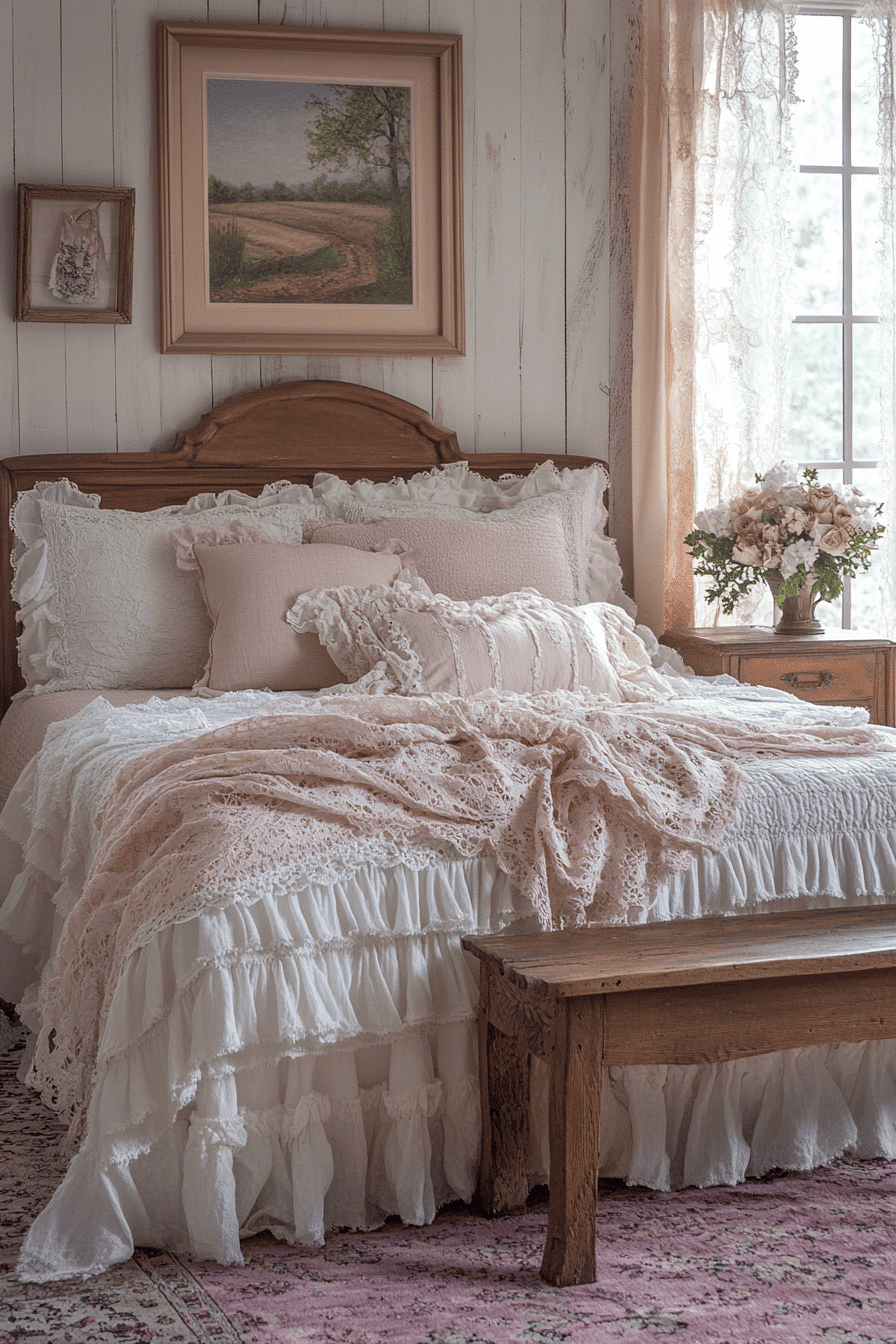 Vintage ruffle layers in bedding and curtains create a playful yet elegant look in a shabby chic bedroom. The softness of each layer adds depth and movement to the overall design. Mix in lace or eyelet fabric for even more texture. This look works best in whites, creams, or soft pastels to maintain subtlety. It transforms a simple room into a cozy and romantic haven. Tap here to see more vintage ruffle layering ideas!
