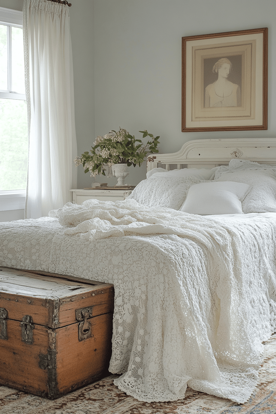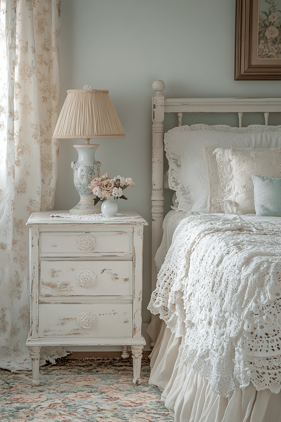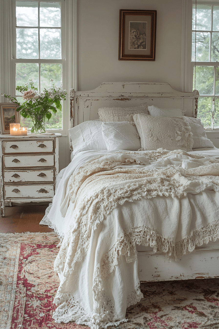 Mixing heirloom-inspired textures brings richness to a vintage shabby chic bedroom. Combine lace, crochet, linen, and embroidery in small touches across the space. These layers make even the simplest room feel collected and meaningful. Keep the palette neutral to let the textures shine. It’s an effortless way to add personality. Click now to explore heirloom texture blends you’ll adore.
