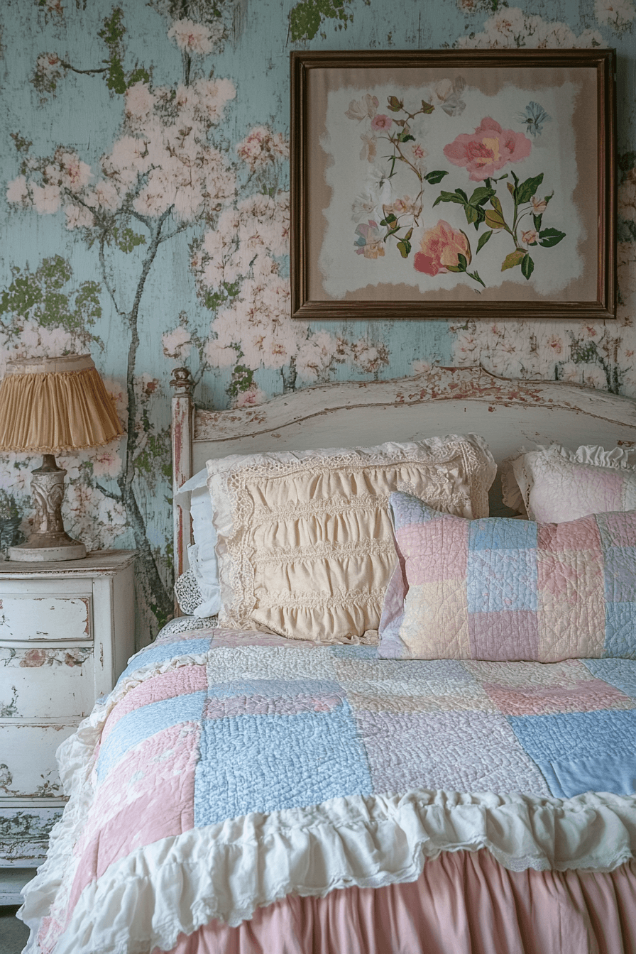 A pastel quilt becomes the centerpiece of comfort in a vintage shabby chic bedroom. Choose faded floral or patchwork patterns in soft hues like lavender, mint, or blush. Layered with ruffle-edged pillows and simple sheets, it brings warmth and texture. A distressed bedframe and whitewashed side tables enhance the nostalgic feel. The quilt adds both visual interest and coziness. Tap to discover beautiful pastel quilt setups for your bedroom.