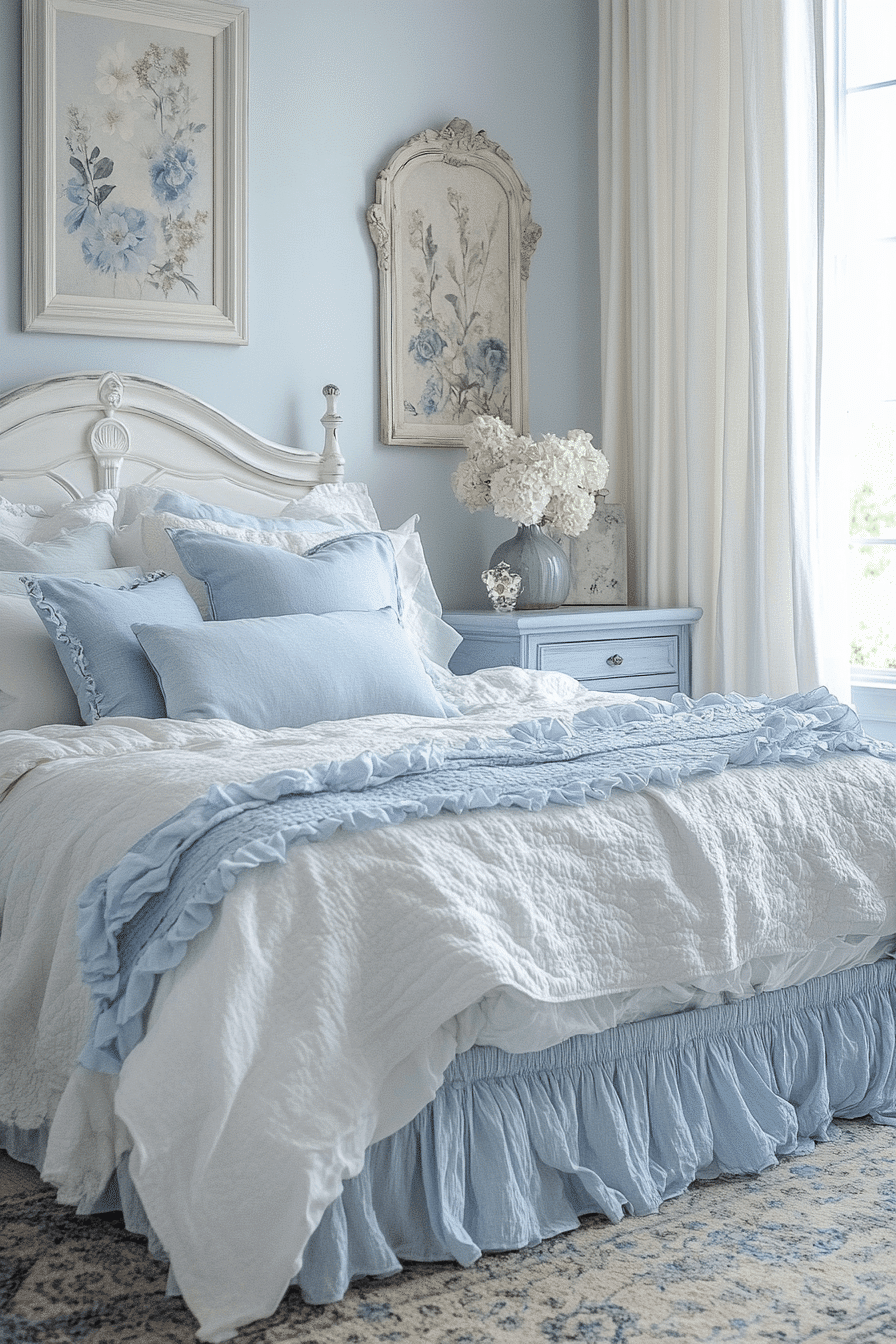 Pale blue evokes peace and serenity in a vintage shabby chic bedroom. Use it for wall color, bedding, or a painted dresser to introduce softness. Paired with whitewashed furniture and lace curtains, it creates a coastal-feminine feel. This hue complements neutrals and pastels effortlessly. The space feels like a breath of fresh air. Click to explore peaceful pale blue bedrooms now.