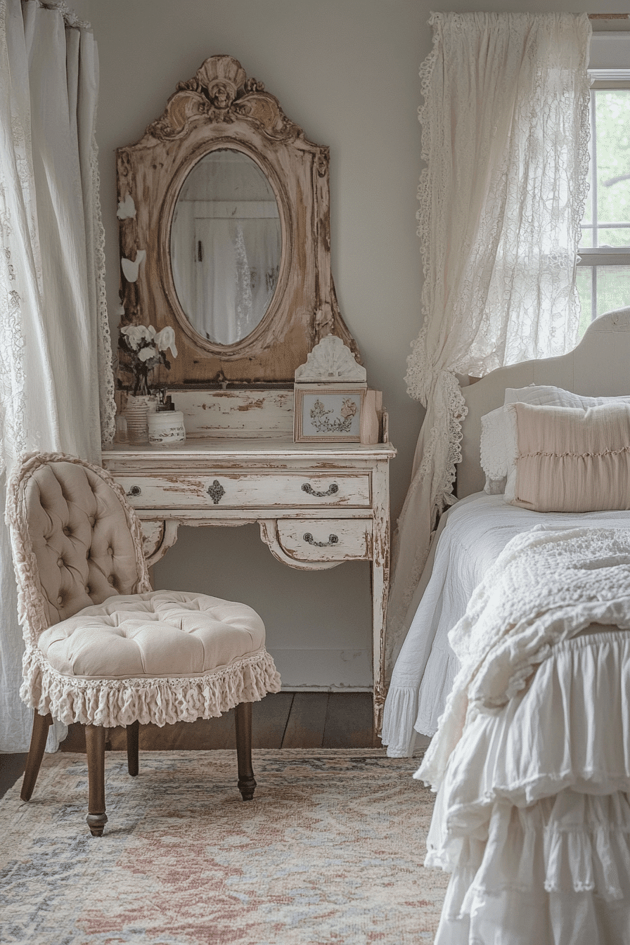 A distressed vanity adds beauty and function to a vintage shabby chic bedroom. The chippy paint and ornate mirror frame create visual charm. Styled with antique perfume bottles and a lace runner, the space feels both nostalgic and personal. Soft lighting makes it even more inviting. This cozy corner becomes a highlight in the room. Tap here to create your own vintage vanity setup.